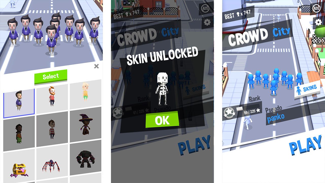 در مراحل اولیه Crowd City، پوستههایی که میتوانید انتخاب کنید به چند آدمک با رنگهای مختلف محدود میشود، اما هرچه جلوتر میروید پوستههای جدید که چیزهایی اعم از جنهای کریسمس، عنکبوت، تمساح، گوزن، بازیکنان راگبی، زامبی، نینجا و… هستند دریافت میکنید. برای دریافت هر پوسته جدید، باید ماموریت تعیین شده مخصوص آن را انجام دهید؛ مثلا باید یک لشکر ۱۰۰ نفره جمع کنید یا حداقل یک حریف را کاملا از بازی محو کنید یا با رکورد زدن رده خود را ارتقا دهید. تنوع و تعداد پوستهها آنقدر زیاد است که باید حسابی در بازی حرفهای شوید تا بتوانید تمام آنها را بهدست بیاورید. قابلیت پوستهها تفاوتی باهم ندارد و فقط در ظاهر با یکدیگر متفاوتند.