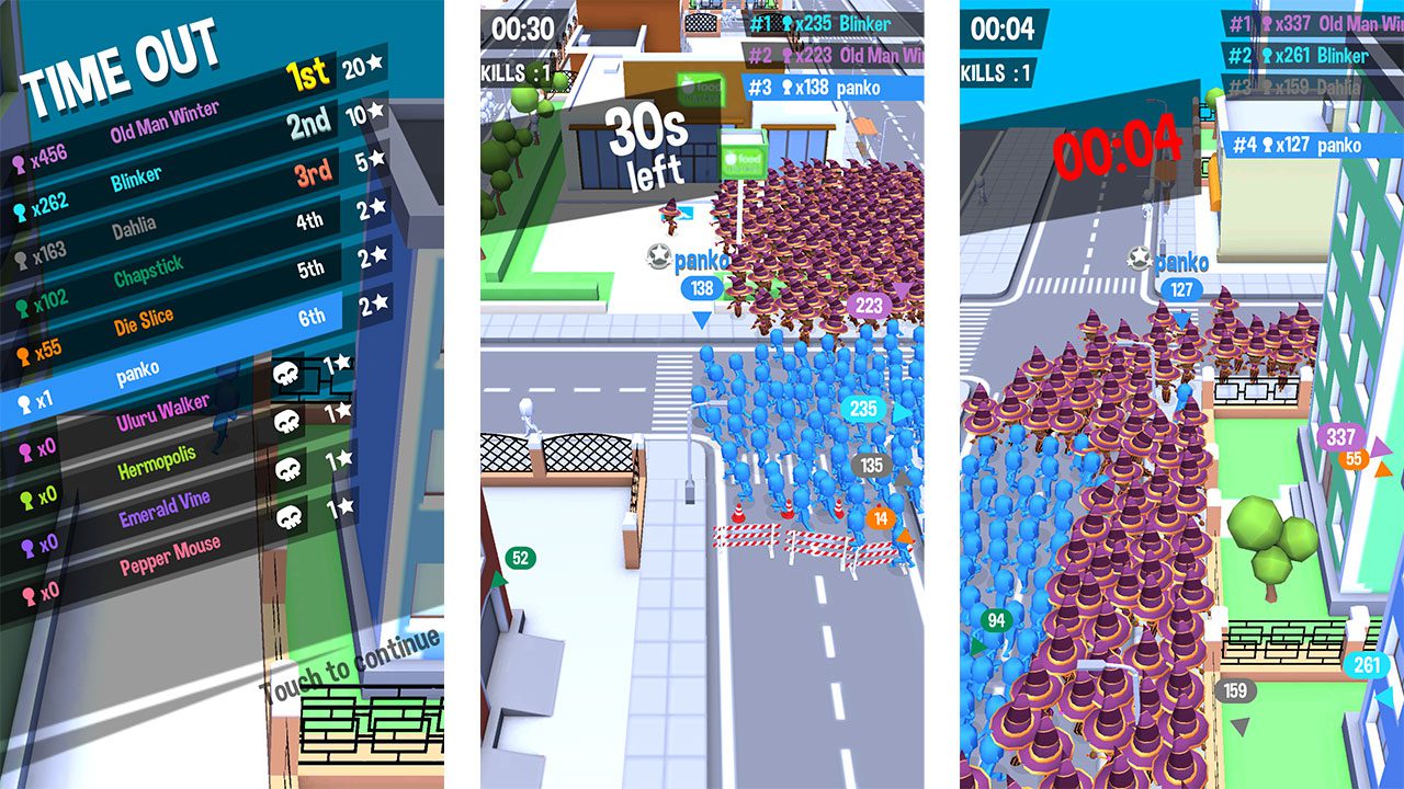 حتما با خواندن توضیحات بالا فکر میکنید قرار است با فراغ بال در خیابانها بدوید و آدمها را به اسارت خودتان درآورید و امتیاز بگیرید، اما نه! از این خبرها هم نیست؛ خیلیها فکر میکنند Crowd City یک بازی مولتیپلیر آنلاین است اما درواقع شما با ۹ بازیکن دیگر که واقعی نیستند و از گزینههای پیشفرض بازی هستند مسابقه میدهید. قسمت خطرناک بازی اینجاست؛ فرار یا مغلوب کردن بازیکنان دیگر. این بازیکنان هرچند واقعی نیستند اما رحم و مروت و ترس هم سرشان نمیشود؛ روند بازی به اینصورت است که شما درحال ساختن لشکر خود، یک عدد که تعداد دنبالهروهایتان را نشان میدهد میبینید، چند فلش رنگی با عددهای مختلف هم در جاهای دیگر نقشه هستند که همان بازیکنان حریفاند. عدد هر لشکری که بزرگتر باشد میتواند لشکر کوچکتر را مغلوب کند و از بین ببرد؛ وقتی شما بهسراغ یک لشکر کوچکتر میروید میتوانید تمام افراد آن لشکر را به افراد خودتان تبدیل کنید، اگر تا نفر آخر آن لشکر را هم از بین ببرید، ۱۰نفر اضافه هم بهعنوان جایزه نصیبتان میشود!