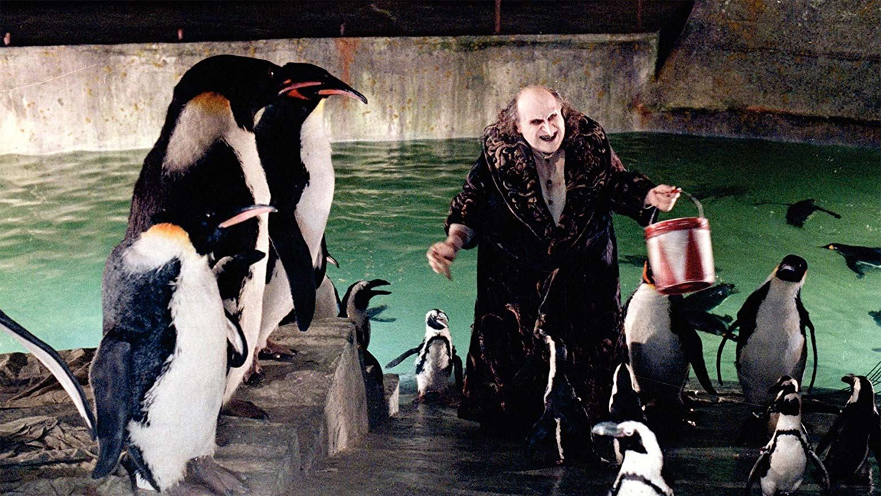 دنباله Batman با نام Batman Returnsدر سال ۱۹۹۲ میلادی روی پرده نقرهای آمد و تقابل شوالیه تاریکی با شخصیتهای کتوومن و پنگوئن را به تصویر میکشد. قسمت دوم به هیچ وجه نتوانست موفقیتهای برادر بزرگتر خود را در زمینه بازخوردهای دریافتی و فروش جهانی تکرار کند. با این حال، نقاط قوتی دارد که نمیتوان نادیدهشان گرفت. یکی از آنها، نقشآفرینی دنی دویتو (Danny DeVito) به عنوان اوسوالد کابلپات/پنگوئن است. اوسوالد در خانوادهای ثروتمند به دنیا آمد اما از آنجایی که شکل و شمایل عجیبی داشت، از سوی والدین ترد شد. او سالهای بعد زندگی خود را با پنگوئنها گذراند و همین موضوع باعث شده از لحاظ رفتار و عادتهای غذایی شباهت بسیار زیادی به آنها داشته باشد.