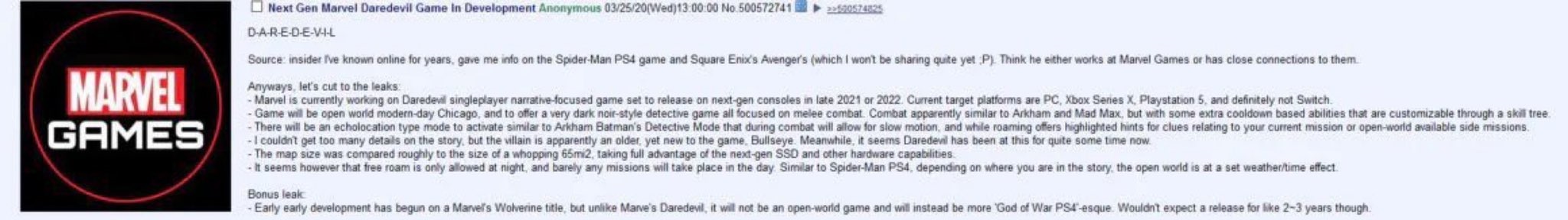 در میان نظرات جدید طرفداران در اینترنت، یکی از کاربران توئیتر نیز تصویری منتشر کرده که شما در زیر میتوانید آن را مشاهده کنید. او مدعی است این عکس شامل اطلاعاتی از بازی Daredevil میشود. این تصویر مربوط به سال ۲۰۲۰ میشود و در آن به بازی Marvel’s Wolverine نیز اشاره شده بود. همچنین در این تصویر آمده که این عنوان قرار است یک بازی تکنفره متمرکز بر روایت باشد، چیزی که Skydance New Media نیز تاکید زیادی روی آن داشت. همچنین طبق این تصویر بازی Daredevil برای پلتفرمهای رایانههای شخصی، پلیاستیشن 5، اکسباکس سری اس و اکسباکس سری اکس در حال ساخت است و خبری از انتشار آن برای پلیاستیشن 4، اکسباکس وان و نینتندو سوییچ نخواهد بود.