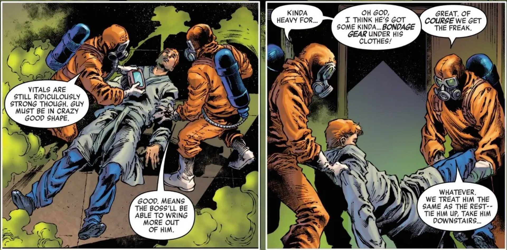 اما «صلاحالدین احمد» (Saladin Ahmed) در مسیر جدید روایت، استفادهای هوشمندانه و غیرمنتظره از این لباس کرده است. پس از آنکه مت بین نجات فاگی و «بولزآی» مجبور به انتخاب میشود و در نهایت تصمیم میگیرد بولزآی را به مرگ واگذارد، حس گناه و عذاب وجدان او را از لباس فعلیاش دلزده میکند. همین موضوع باعث میشود او دوباره به سراغ همان لباس منفور برود.