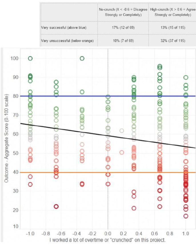 طبق نظرسنجی که Game Outcomes Project در سال ۲۰۱۴ انجام داده است، از صدها نفر در صنعت بازیهای ویدیویی سوالاتی مربوط به تجربه اضافهکاریهای بیش از حد، پرسیده شد که یکی از سوالات این بود:« آیا در پروژه خود کرانچ یا اضافه کاری بیش از حد را تجربه کردهاید؟». شرکتکنندگان از بین دو عدد «۱- (کاملا مخالف)» و «۱ (کاملا موافق)» عددی را انتخاب میکردند. در این نظرسنجی میخواهیم نشان دهیم که آیا ارتباطی بین موفقیت یک پروژه با میزان کرانچ وجود دارد یا خیر؟