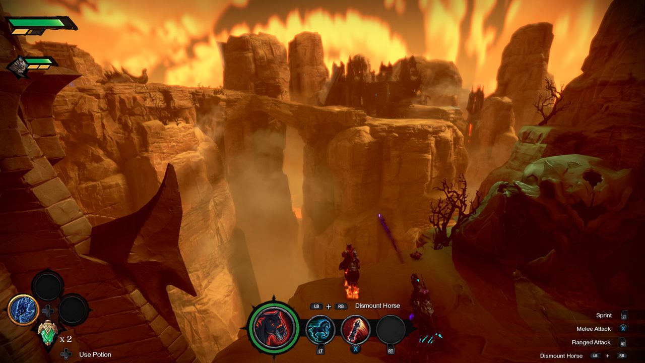 از جنبهی گیمپلی نباید دارک سایدرز را یک اثر کپی پیست شده از دیابلو بدانیم چون این دو بازی تنها از جنبهی ظاهری تا حدودی به یکدیگر شبیه هستند. سازندههای دارک سایدرز جنسیس تمام تلاش خود را به کار گرفتهاند تا گیمپلی بازیشان تا حد چشمگیری از زیر سایهی عناوین مطرح در سبک هک اند اسلش بیرون بیاید. اولین و مهمترین مسئله در این رابطه را میتوان به حق انتخابهای بازیکن در محیط بازی اشاره کرد. همانطور که در ابتدای بررسی بازی Darksiders Genesis اشاره کردیم، شما هر زمان که دلتان بخواهد این توانایی را دارید بین دو سوارکار، یعنی War و Strife سوییچ کنید. بازی هیچوقت شما را وادار نمیکند یک مرحله را حتما با Strife بازی کنید یا حتی هیچ الزام و اجباری روی شما نیست که تنها در یک منطقه از نقشه حضور داشته باشید. هر زمان دلتان بخواهد، میتوانید اسب خودتان را احضار کرده و به کل سرزمین موجود در نقشه سفر کنید. هر چند اسب سوارکار در برخی از نقاط، اجازهی ورود ندارد و کاراکتر باید مابقی مسیرش را پیاده طی کند. اگر چنین اتفاقی افتاد، احتمالا جلو روی قهرمانهای ماجرا باس یا مینیباسهایی قرار دارند؛ شاید هم سازههایی در آن بخش از نقشه وجود دارد که منطقی نیست با اسب وارد آن قسمت شد. در هر صورت، برای پیمودن برخی از مسیرها مجبور هستید با پای پیاده به سمت مقصد حرکت کنید که الزاما اتفاق چندان بد و آزاردهندهای نیست. در بازی هیچ نشانه یا به اصطلاح Navigator خاصی وجود ندارد که شما را به سمت و سویی مستقیم هدایت کند. بازیساز به شما اجازه میدهد به رسم دیگر بازیهای نقشآفرینی کلاسیک، تا حد امکان خودتان مسیرتان را پیدا کنید و از گشت و گذار در نقشهها لذت ببرید. سوال اینجاست آیا گشت و گذار در مراحل مختلف بازی، ثمرهی خاصی نیز در بر دارد؟