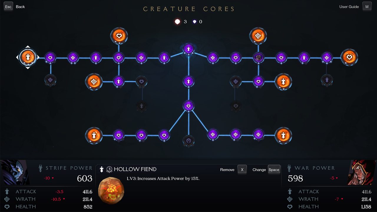 از طرفی در دارک سایدرز جنسیس دیگر فقط با والگریم سر و کله نمیزنید. موجود دیگری به اسم Dis هم در بخش دیگر هاب مرکزی حضور دارد که در قبال پیشکشِ روحهایی که از کشت و کشتار به دست میآورید، به شما تکنیک برای مبارزه یاد میدهد که انصافا به جذابیت مبارزات به شدت کمک میکند. البته ایراد مهمی به این ساز و کار وارد است که اگر بازیکن پیگیری باشید و تمام سوراخ سنبههای نقشه را بگردید، از نیمهی بخش داستانی به بعد، شخصیتها به قدری قدرتمند میشوند که رسما به Dis و Vulgrim چندان محتاج نیستند. قدرتمندی سوارکارهای آخرالزمانی نشات گرفته از المان دیگری است که تحت عنوان درخت ارتقا در این بازی میشناسیم.
