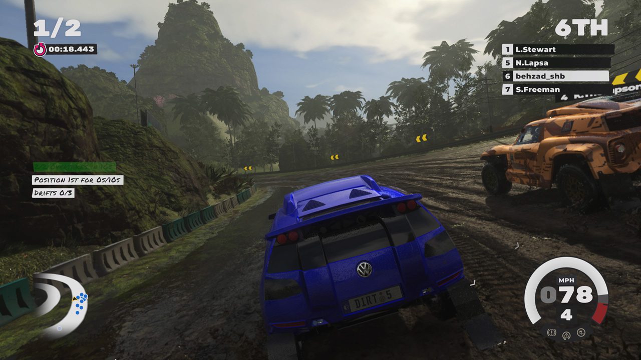 در همان ابتدای کار هندلینگ منحصر به فرد بازی حسابی حس بودن در یک پیست رالی را به بازیکن منتقل میکند. بدون شک هندلینگ یکی از مهمترین مواردی به شمار میآید که میتواند یک بازی ریسینگ را ارزشگذاری کند و باید اعتراف کرد که به لحاظ هندلینگ عملکرد بازی Dirt 5 کاملا بینظیر است! قوت این موضوع زمانی به نحو احسن خودش را نشان میدهد که در همان حالت کریر کمی جلوتر بروید و با ماشینهای بیشتری مسابقه بدهید. همچنین مسیرهای مسابقهای متفاوت با آب و هوای گوناگون را هم مورد تحلیل و بررسی قرار دهید. بازی درت 5 در بخش هندلینگ عملکردی مثال زدنی دارد و کدمسترز برای این بخش طراحی استادانهای داشته است.