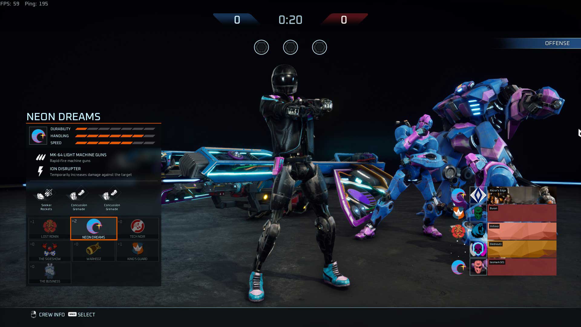 این تست بتا روی سه پلتفرم پلیاستیشن ۴، ایکسباکس وان و پیسی (از طریق استیم) برگزار شد که دو روز اول به صورت خصوصی و دو روز دیگر عمومی بود. در Disintegration مخاطب کنترل یک فرمانده را بر عهده دارد که سوار یک سفینهی جنگی به نام Gravcycle میشود و همزمان رهبری یک گروه از مبارزان را هم بر عهده میگیرد. فرماندهان در بازی حکم هیرو را دارند که هر کدام سفینه و گروهی با قابلیتهای متفاوت را در اختیار دارد. در تست بتا هفت فرمانده مختلف در دسترس قرار داشت که تنوع خوبی هم داشتند؛ از ظاهر که سامورایی و شوالیه تا دلقک و تیپهای پانک و رترو را شامل میشود گرفته تا نوع سلاحها و تواناییهای گروه. با توجه به این موارد، برخی هیروها زمان بیشتری برای حرفهای شدن در کنترلشان نیاز دارند. مثلا The Sideshow از یک سلاح پرتاب نارنجک بهره میبرد که منفجر کردن آنها با یک دکمهی جدا انجام میشود و از سوی دیگر یه گروه چهار نفره در اختیار دارد که بزرگترین گروه حساب میشود. این قابلیتها پیچیدگی تاکتیکی این هیرو را بالا میبرد، ولی در عین حال تسلط رویشان زمان میبرد. بهشخصه Neon Dreams و Tech Noir را به بقیه ترجیح دادم؛ اولی خط سلامتی زیادی ندارد، اما مانور زیادی برای حرکت دارد و میتوان با کمی دقت بهسرعت از موقعیتهای خطرناک نجات پیدا کرد. ماشینگان نسبتا قدرتمند و قابلیتهای کارآمد گروه مثل موشکهای دوربرد او را به یک مبارز بسیار مناسبت تبدیل میکند. هیروی Tech Noir هم یک ساپورت به حساب میآید؛ یک سلاح دارد که سلامتی یاران را بهبود میبخشد و با یکی از قابلیتها، دشمنان را در محدودهی مشخص آهسته میکند تا کار نابودیشان راحتتر انجام شود.