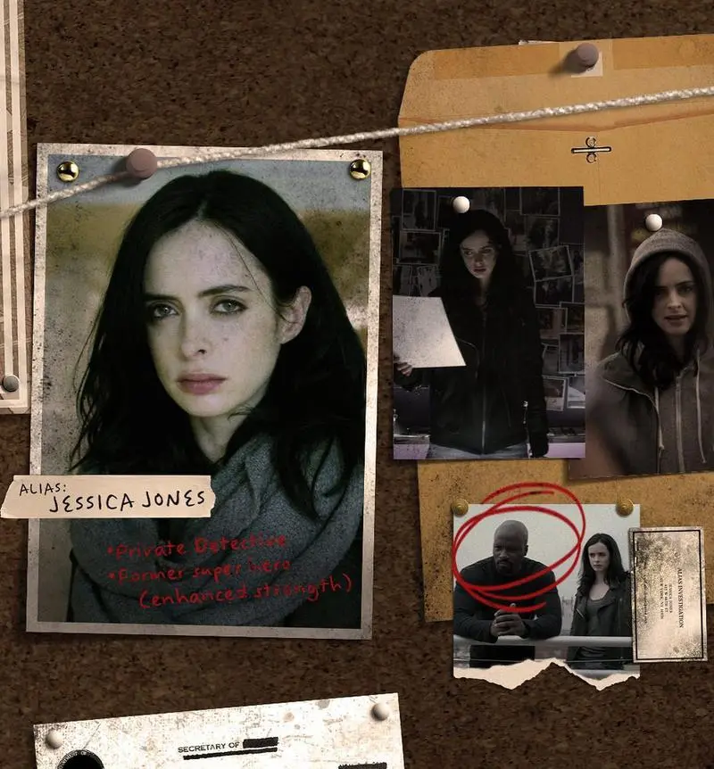 در تصویر سوم، جسیکا جونز کریستن ریتر هم بهعنوان کارآگاه خصوصی و هم بهعنوان ابرقهرمان سابق با قدرتهای فوق بشری توصیف شده است.