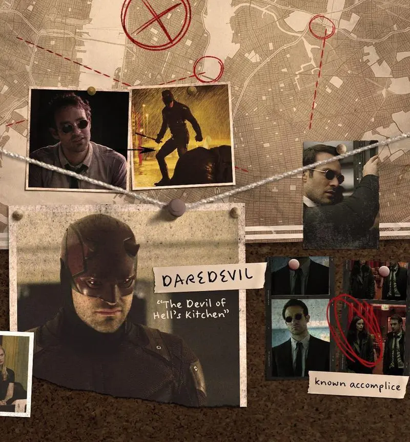 در تصویر دوم، دردویل چارلی کاکس با هر دو ظاهر شیطان هلزکیچن و مت مورداک در عکسهای مختلف دیده میشود. همچنین دور عکسی از جسیکا جونز کریستن ریتر (Krysten Ritter) خط کشیده شده و بهعنوان “همدستی آشنا” توصیف شده است.