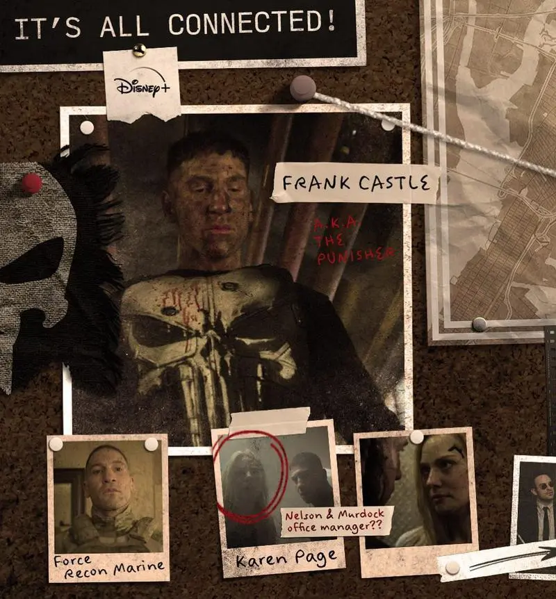 در تصویر اول، عکس پانیشر جان برنتال (Jon Bernthal) بههمراه برچسبی که نام او روی آن نوشته شده است را میتوان مشاهده کرد. این عکس همچنین به عضویت فرانک کسل در نیروی دریایی ارتش و شخصیت کارن پیج از سریال دردویل اشاره میکند.