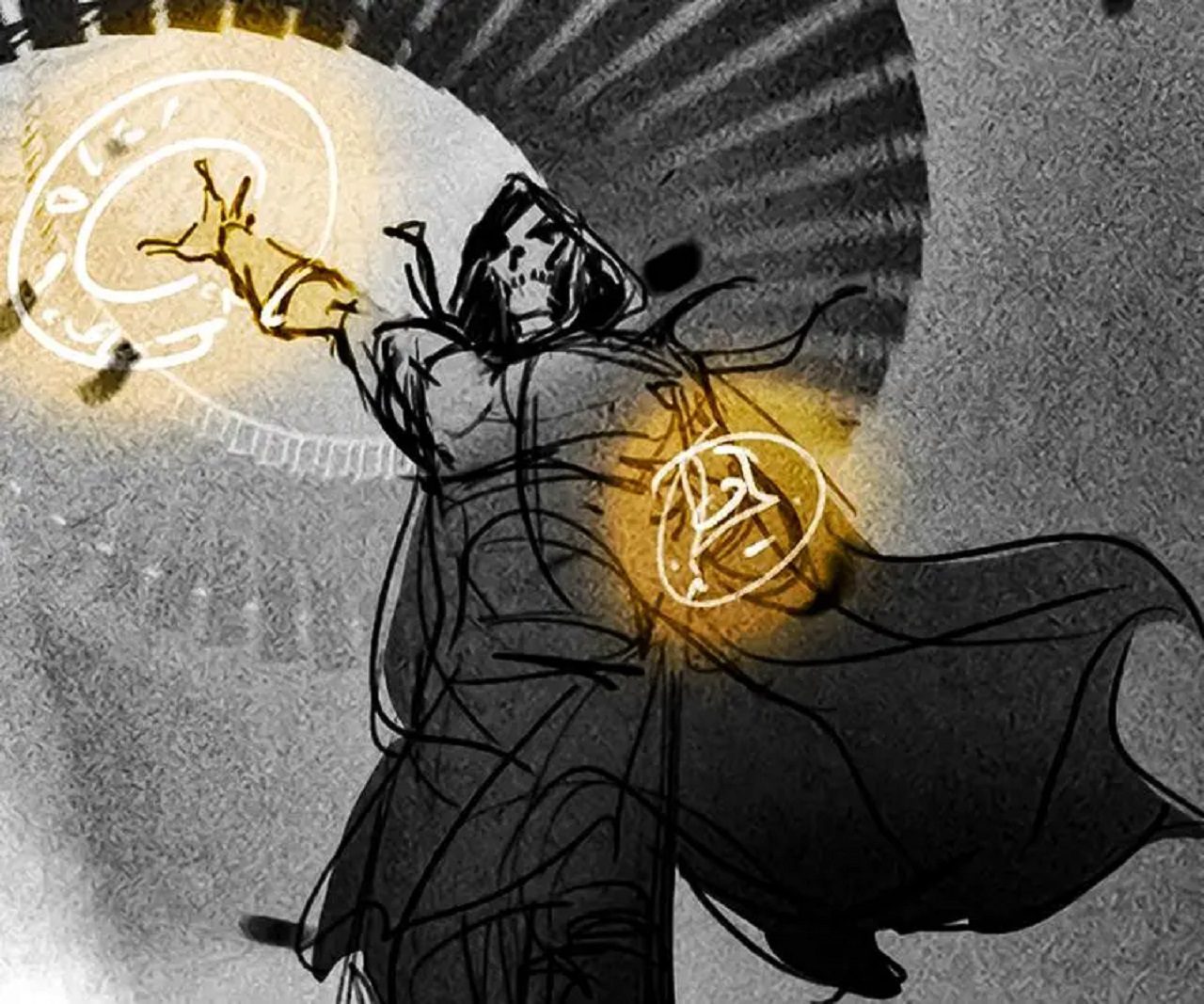 دکتر استرنج در این تصویر شمشیر به دست گرفته است، در حالی که نایتمر از جادوی خود به عوان یک سلاح قدرتمند استفاده میکند.