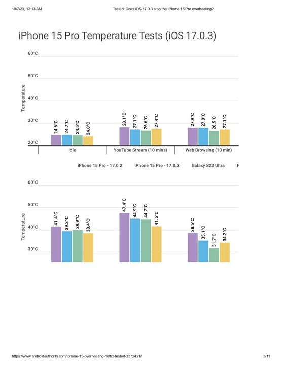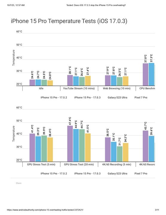 دمای آیفون ۱۵ پرو در حالت عادی، مثل گلکسی اس ۲۳ اولترا و پیکسل ۷ پرو تقریبا کمتر از ۲۵ درجه بود. اما با ۱۰ دقیقه تماشای ویدیو در یوتیوب، این میزان به ترتیب در iOS 17.0.2 و iOS 17.0.3 حدودا ۴ و ۳ درجه افزایش پیدا کرد که یک درجه بهتر شد. ۱۰ دقیقه زیر فشار سنگین روی پردازنده، دمای گوشی به ۳۷ درجه رسید که باز هم هیچ تفاوتی در مقایسه با قبل نداشت اما همچنان گلکسی اس ۲۳ اولترا و پیکسل ۷ پرو خنکتر ظاهر شدند.