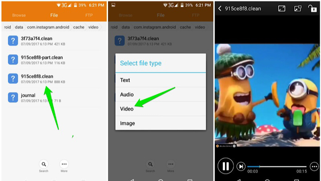 در صفحه باز شده باید روی com.instagram.android ضربه بزنید و پوشه cache را انتخاب کنید. سپس یک صفحه دیگر به شما نشان داده میشود که باید پوشه videos را باز کنید. در این بخش تمام ویدیوهایی که در این شبکه اجتماعی پخش شدهاند قرار گرفته و همگی دارای پسوند clean. هستند. برای مشاهده ویدیو مورد نظر روی آن ضربه بزنید و گزینه Video را انتخاب کنید.