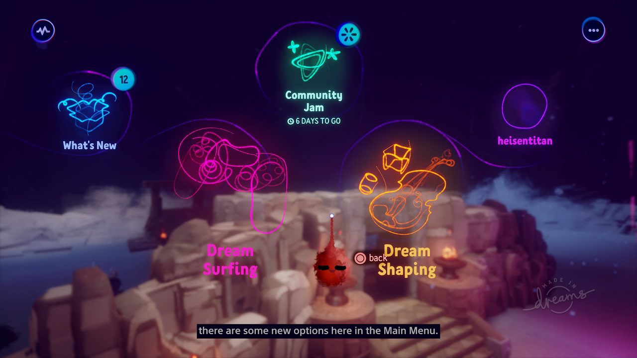 در بخش Dream Shaping ماجرا متفاوت به نظر میرسد؛ این بخش برای ساخت بازیای که مخاطب در نظر دارد طراحی شده است. سازندگان بخش آموزشی عنوان Dreams را به شدت راحت و قابل فهم ساختهاند به طوری که اگر بازیکن هیچ دانشی در زمینهی ساخت بازی نداشته باشد هم با آموزشهای موجود در این بخش، میتواند به راحتی به ساخت و ساز مشغول شود. در ابتدا شاید تصورتان از «بخش آموزشی» یک بخش کوتاه در ابتدای بازی باشد، اما پس از آن که اولین قسمت از آن را تمام میکنید، تازه متوجه وسعت و غنی بودن محتوای آن خواهید شد. در بررسی اصلی به طور مفصل به این بخش خواهم پرداخت. یکی دیگر از مواردی که در این قسمت با آن مواجه خواهید شد، بخش Enter The Community Jam است که بیشتر به بخش مسابقهی آنلاین بازی شباهت دارد. در اینجا شما باید با توجه به موضوعی که خود بازی برای شما تعریف میکند، شروع به ساخت کنید و نهایتا با توجه به رای دیگر کاربران به اثر شما، در این مسابقه برنده شوید. البته این موضوعات هر چند هفته یکبار تغییر خواهند کرد. یکی از نکات مثبت قسمت Dream Workshop در بخش Dream Shaping تفکیک موضوعات آموزشی است؛ از آموزشهای مقدماتی گرفته تا تفکیک موضوعی به صورت طراحی شخصیت، صداگذاری، انیمیشن و غیره.