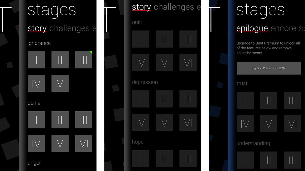 اسم مراحل بخش داستانی یا اصلی، از روی مدل کوبلر-راس با اندکی دخل و تصرف انتخاب شدهاست. کوبلر-راس یا پنج مرحله اندوه بیانگر حالات احساساتیست که در مواجهه با فقدان و از دست دادن فرد نزدیکی بر اثر مرگ، در انسان پدید میآید. این مراحل متشکل از: انکار، خشم، تقلا، افسردگی و پذیرش است. در Duet مراحل به این ترتیب نامگذاری شدهاند: ناآگاهی، انکار، خشم، تقلا، گناه، افسردگی، امید و پذیرش.