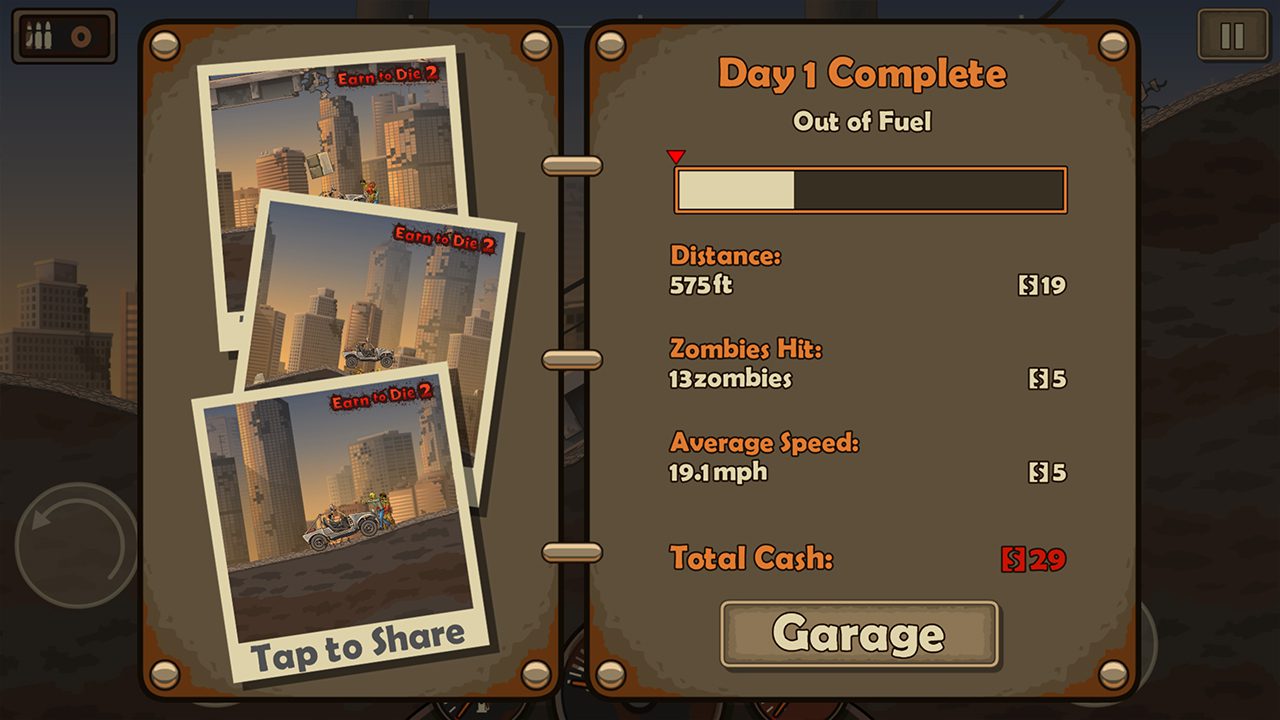 دور Earn To Die همین است؛ ماشین جدید و مرحله تازه، کشتن زامبیها و پول درآوردن، ارتقا و اضافه کردن امکانات به وسیله نقلیه و دوباره ماشین جدید و مرحله تازه. البته بههمین سادگی نه! زامبیها با بالا رفتن مراحل جانسختتر و سریعتر و خطرناکتر میشوند و بعضی جاها فرار کردن از دستشان بهصرفهتر است. از این گذشته موانع مسیر هم با بالا رفتن مراحل، رفته رفته آنقدر سخت میشوند که رد کردنشان به مهارت لازم دارد. یکی دیگر از نکات جذاب Earn To Die، همین کسب مهارت در بازی است؛ جدا از اینکه باید ظرفیت باک را بالا ببرید یا بدنهی ماشین را با سپرهای محکم بپوشانید تا بتوانید روی نقشه بازی بیشتر پیش بروید، باید به مهارت استفاده به موقع از پدال گاز و چرخش و دکمه بوستر هم دست پیدا کنید. البته نگران نباشید؛ هرچه در Earn To Die جلوتر بروید، تجربه و مهارت بیش تری کسب میکنید و در مراحل آخر بازی تبدیل به یک حرفهای میشوید.