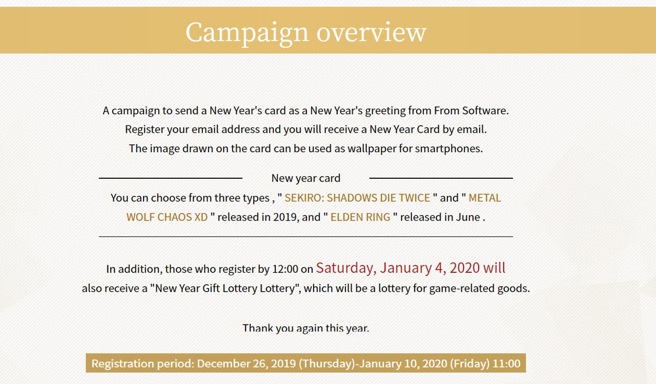 سایت Wfftech صفحهای را در سایت رسمی From Software یافته است که به کمپینی مخصوص سال نوی میلادی اشاره دارد. در این صفحه به مراجعهکننده پیشنهاد داده میشود تا از بین سه بازی Sekiro و Metal Wolf Chaos XD و Elden Ring یک والپیپر مخصوص گوشی دریافت کنند.