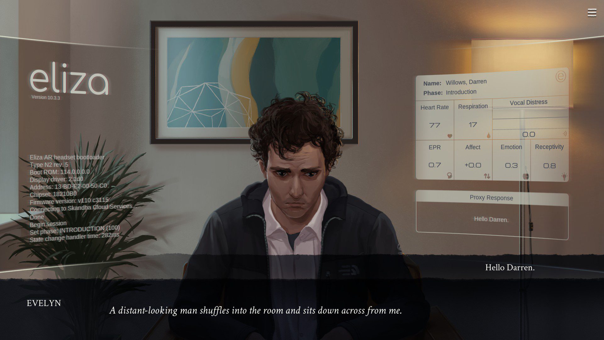 استودیوی مستقل Zachtronics بیشتر به خاطر ساخت عناوین معمایی متفاوت مشهور است که چون Spacechem و Opus Magnum با دنیای شیمی سرکار دارند یا مثل Shenzhen I/O و TIS-100 شما را به دنیای برنامهنویسی میکشانند، اما این استودیو در جدیدترین اثر خود یعنی Eliza به سراغ سبک ماجرایی و به طور خاص ویژوال ناول رفته است. داستان بازی در شهر پیشرفته و تکنولوژیمحور سیاتل میگذرد. قدمهای مهمی در حوزههای واقعیت افزوده و هوش مصنوعی برداشته شده و رقابت شرکتهای بزرگ شدیدتر از همیشه است. یکی از این شرکتهای بزرگ به نام Skandha برنامهای مجازی به نام Eliza خلق کرده که تحولی در درمان مشکلات روانیست. این مشاور مجازی تمام حرکات، رفتارها و صحبتهای یک بیمار را آنالیز و در نهایت یک روش درمانی به او پیشنهاد میکند. بازی از دید زنی به نام Evelyn روایت میشود که بهتازگی شغلی در Skandha پیدا کرده است و به عنوان یک واسطه بین الایزا و بیماران، محیطی بهتر را برای مشاوره فراهم میکند. بخشی از روایت بازی به همین صورت میگذرد؛ افراد مختلفی روبروی اِوِلین مینشینند و از مشکلات خود میگویند. از سوی دیگر الایزا این حرفها و حرکات را آنالیز میکند و با پرسیدن سوالات مناسب به راه حل نهایی میرسد. تنها کاری که اِوِلین باید بکند، به زبان آوردن این سوالات است تا مراجعهکننده احساس کند که این سوالات توسط یک انسان پرسیده میشود. تنها وظیفه این افراد واسطه که در بازی Proxy نام دارند همین است. بهتر بگویم، وظیفهشان این است که چیز بیشتری نگویند. به طور ذاتی وقتی کسی نزد شما از مشکلاتش میگوید و درد و دل میکند، سعی میکنید تا با صحبتهایی به او آرامش دهید و به او در حل مشکلش کمک کنید، اما وقتی واسطهی الایزا هستید این کار ممنوع است. این کار هم روند مشاوره را خراب میکند و هم ممکن است نتیجهی مثبتی برای مراجعهکننده در پی نداشته باشد. اما پیروی از این دستور آسان نیست. کل روند کار الایزا این است که سوالاتی بپرسد و یک روش درمان تجویز کند، اما بعضی افراد برای تسکین تنها نیاز به شنیدن جملاتی دارند که گفتنشان تنها از یک انسان بر میآید. آیا در این مواقع برنامهای مثل Eliza میتواند بهترین راه حل باشد؟ این یکی از چالشهاییست که بازی برای مخاطب ایجاد میکند؛ اینکه در چنین فرصتهایی چه کاری را انجام خواهید داد؟ آیا به یک هوش مصنوعی پیشرفته اعتماد میکنید یا به ندای قلبتان گوش میدهید؟