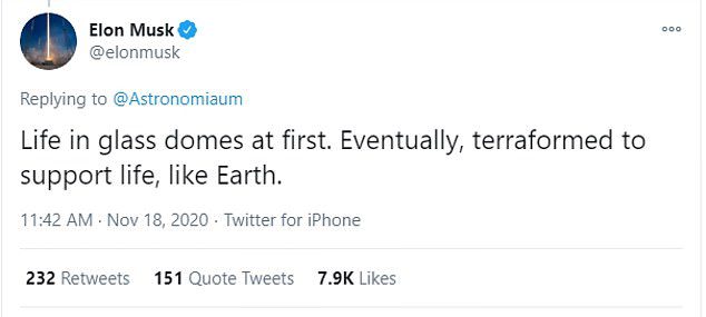 مدیرعامل اسپیس ایکس در توییتر ادعا کرده است که نخستین کلانشهر مریخ به صورت گنبدهای شیشهای خواهد بود. در نهایت انسان مریخ را تسخیر خواهد کرد؛ ولی این اتفاق در طول زندگی ما نخواهد افتاد.