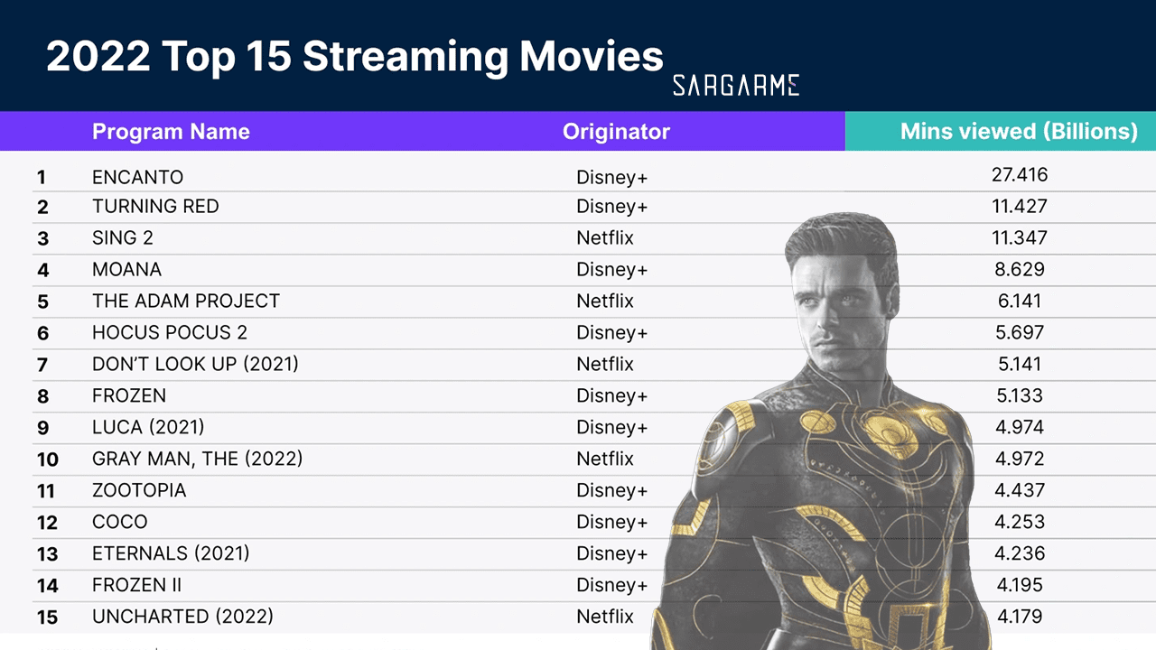 اول از همه باید توضیح بدهم که Eternals پربازدیدترین فیلم بین تمامی آثار حاضر در دیزنی پلاس نیست؛ بلکه تنها فیلم سینمایی (بین تمامی آثار سینمایی) دنیای سینمایی مارول بوده که در سال ۲۰۲۲ در دسته ۱۰ اثر پربازدید دیزنی پلاس قرار گرفت. همچنین همانطور که در تصویر فوق میبینید، این فیلم در لیست ۱۵ اثر سینمایی پربازدید، بین کل شبکههای استریم قرار گرفته که آماری بسیار شوکه کننده است! این یعنی عملا هیچ فیلم دیگری به جز Eternals نتوانسته تا در سال ۲۰۲۲ در دسته ۱۵ اثر پربازدید قرار بگیرد.