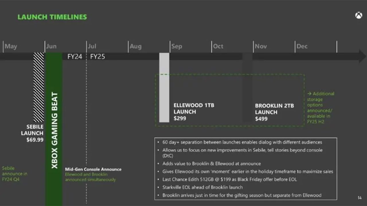 این اطلاعات بیش از هر چیز به نسخه میان نسلی کنسول ایکس باکس سری ایکس اشاره دارند. کنسول میان نسلی برگرفته از قویترین کنسول تاریخ با اسم رمز Brooklin شناخته شده و طراحی استوانهای داشته و از درایو دیسک محروم است. اطلاعات چندانی درباره کنسول کوچکتر خانواده ایکس باکس یعنی ایکس باکس سری اس مشاهده نشده، با این حال ما در گوشه تصویر اطلاعات، عکسی بسیار کوچک از این کنسول میبینیم و اینگونه به نظر رسیده که باید شاهد نسخهای حتی کوچکتر از این کنسول باشیم. ما باید شاهد عرضه این دو کنسول پس از ماه ژوئن سال ۲۰۲۴ باشیم.