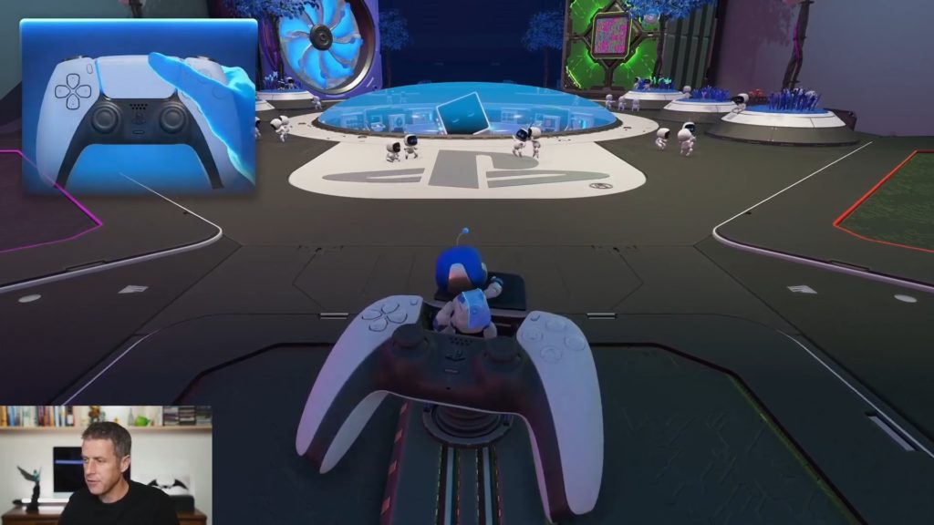 در ابتدای مقایسه، مشخص میشود که دوالسنس از لحاظ ابعاد کمی بزرگتر از دوالشاک است و طبق توصیف کیلی، وزن و «سنگینی» بیشتری دارد، هر چند نه به حدی چشمگیر. علاوه بر این نمای کاملی از پشت کنترلر نیز میبینیم که مشخص میکند خبری از پدالهای اضافه در آن نیست. با ورود به بازی، اولین تجربه از فناوریهای جدید کنترلر DualSense را از زبان کیلی میشنویم. شروع بازی با کشیدن انگشت روی صفحهی لمسی کنترلر PS5 همراه است. اسپیکر داخلی کنترلر حجم و کیفیت صدای بیشتری نسبت به قبلی دارد و صدایی که پخش میکند، کاملا با الگوی بازخورد لمسی (Haptic Feedback) هماهنگ است. در بازی، کاراکتر Astro وارد محیطهای مختلفی از جمله یک واحد CPU میشود که چندین فن بزرگ در آن قرار داد. با نزدیک شدن کاراکتر به این فنها، صدای حرکت باد و گردوغبار به خوبی از کنترلر شنیده میشود و به گفتهی کیلی، لرزش و ارتعاش متناظر آن در کنترلر قابل احساس است. به همین ترتیب صدا و حس حرکت طوفان برفی نیز از طریق کنترلر کاملا به بازیکن منتقل میشود. یکی از بخشهای جالب بازی زمانی است که بازیکن باید یک گردونه را به حرکت در بیاورد و این عمل با فوت کردن داخل میکروفون کنترلر ممکن میشود.