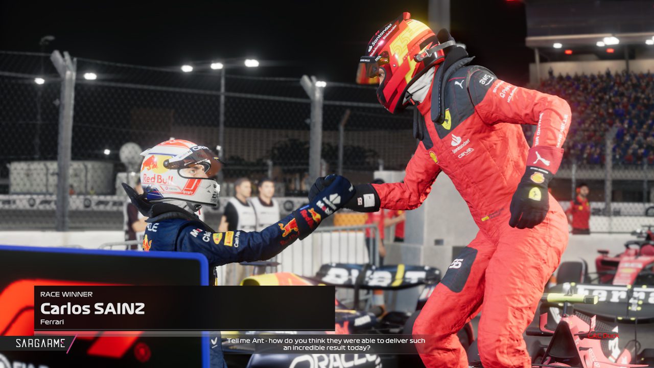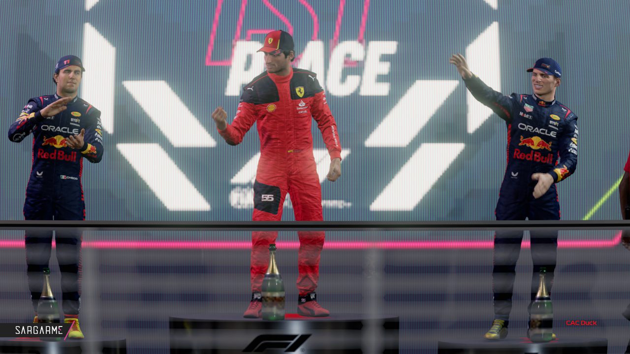 انیمیشنهای این بخش از بازی تکراری بوده و صورتها و انیمیشنهای صورت رانندگان بی روح است. این موضوع باعث میشود جشن پس از مسابقات جذاب و نفس گیر این بازی به شدت زننده و غیر قابل تحمل باشند و از آنجایی که مراسم قهرمانی در مسابقات فرمول یک همیشه یکی از خاطره انگیزترین بخشهای این دنیا بوده، ما انتظار داشتیم که در سال ۲۰۲۳ و با توجه به استانداردهای بازیهای نسل نهمی، توجه بیشتری به این بخش و جزئیات آن شود.