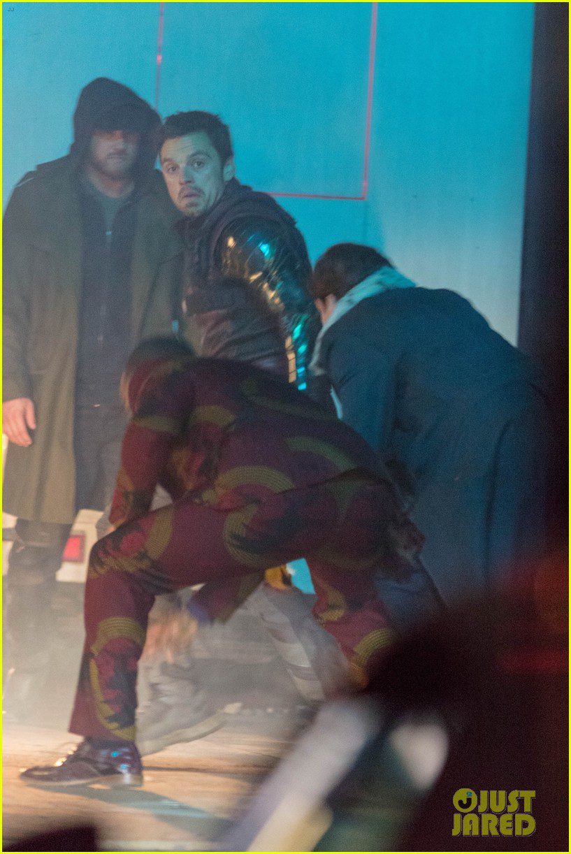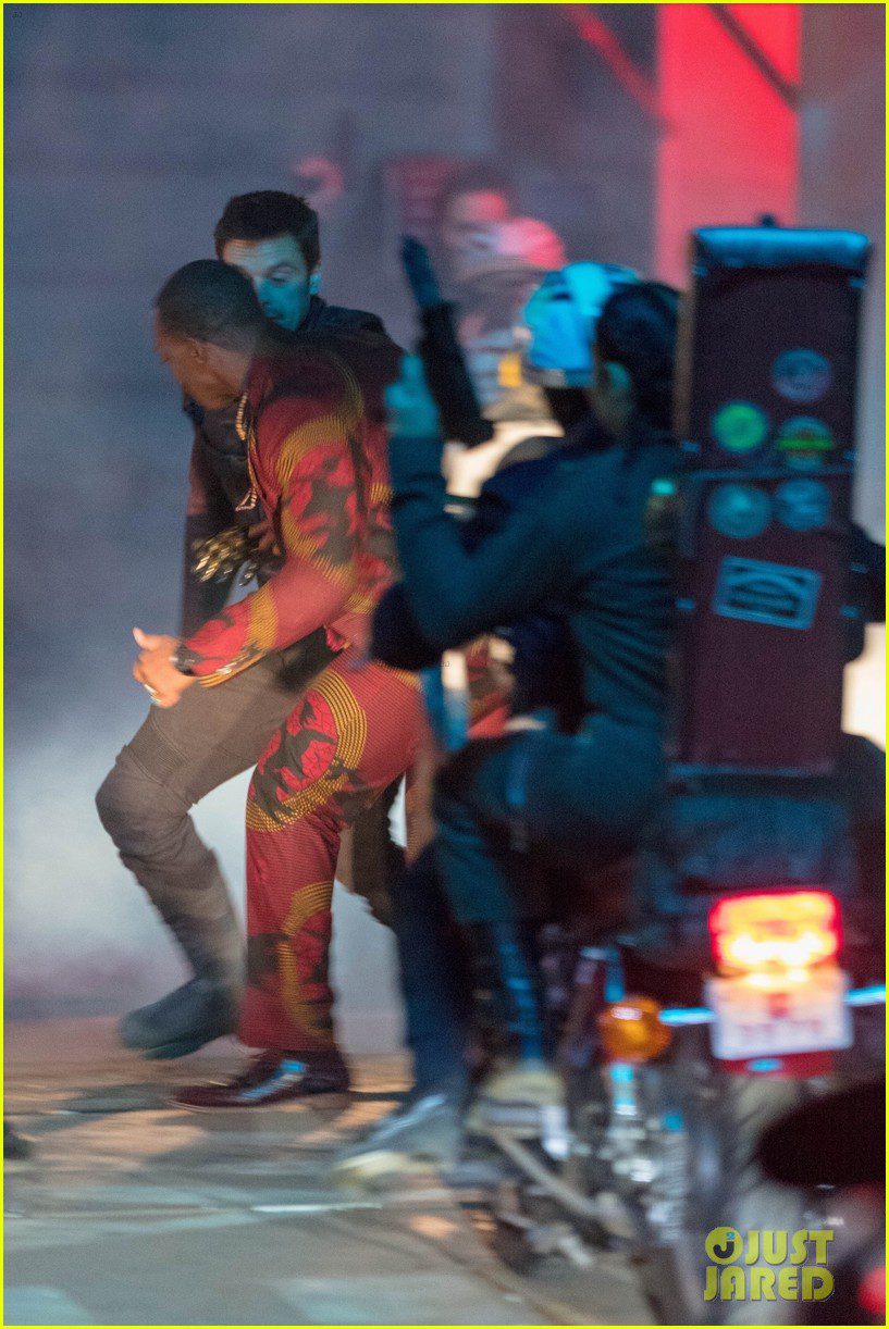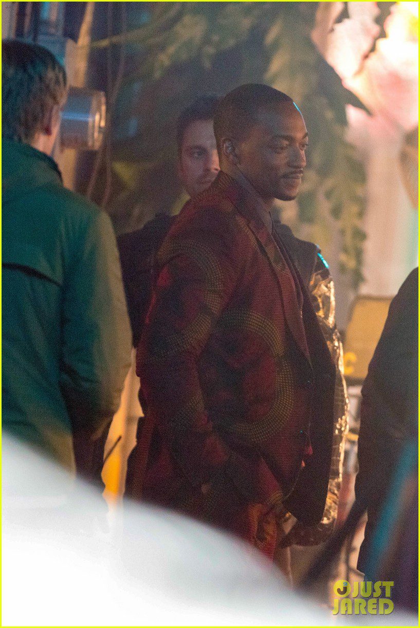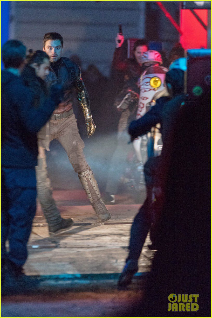 فالکون یا سم ویلسون در این تصاویر یک ست کت و شلوار قرمز رنگ به تن کرده است. در جای جای این ست میتوان دایرهی طلایی رنگ را مشاهده کرد که در وسط آن یک نماد مشکی رنگ مشاهده میشود. تعدادی از این تصاویر در حالی گرفته شدهاند که بازیگران در خارج از کادر بوده و مشغول استراحت هستند تا برداشتهای دیگر بازیگران ضبط شوند. در این میان، برخی از تصاویر هم از حین ضبط یک برداشت گرفته شدهاند.