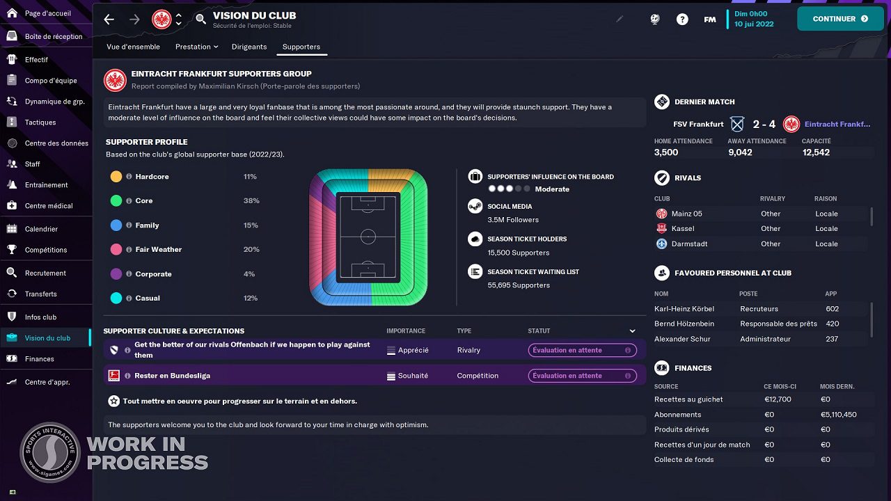 با اضافه شدن بخش شبکههای اجتماعی در نسخه قبلی، حالا این سیستم بهبود پیدا کرده و با بخشی جدید به نام Supporter Confidence ترکیب شده است. این بخش جدید به شما اجازه میدهد تا اطلاعات بیشتری از وضعیت طرفداران تیم خود داشته باشید و خیلی راحت با آنها ارتباط برقرار کنید. طرفداران هر تیم به ۶ گروه مختلف مثل هواداران تعصبی، هواداران معمولی و… تقسیم میشود. هرکدام از این گروهها وفاداری، انتظارات و اولویتهای خاص خودشان را دارند و شما باید سعی کنید تا همه آنها را راضی نگه دارید. مثلاً آن دسته از هوادارانی که معمولاً با عنوان «حزب باد» شناخته میشوند، با چند باخت پشت سر هم کلاً بیخیال حمایت از تیم شما میشوند. این بخش همچنین به شما اجازه میدهد تا از نظر طرفداران درباره بازیکنهایی که خریدید، تاکتیکها و البته عملکرد تیم، با خبر باشید.