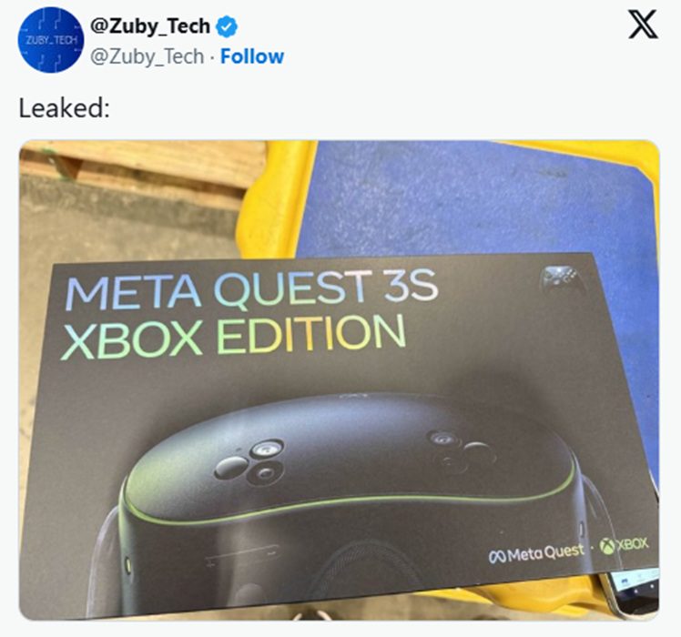 اولین عکس Meta Quest 3S Xbox Edition توسط حساب کاربری Zuby_Tech در شبکه اجتماعی ایکس یا همان توییتر سابق به اشتراک گذاشته شده که بستهبندی این محصول را به نمایش میگذارد. این تصویر فاش شده از Xbox Quest 3S نام این محصول را در بخش جلویی به تصویر کشیده و نام و لوگوی هر دو شرکت ایکس باکس و متا را در گوشه سمت راست جعبه به نمایش میگذارد.