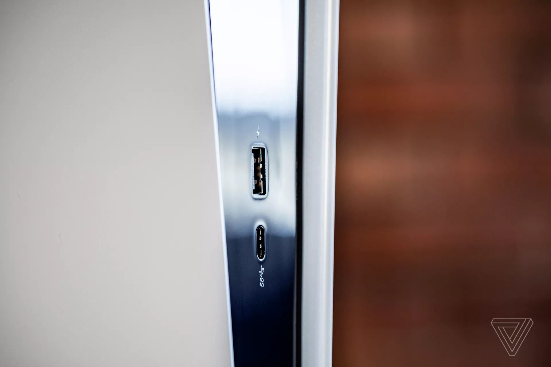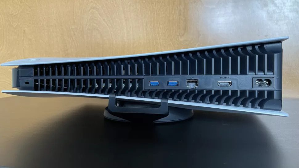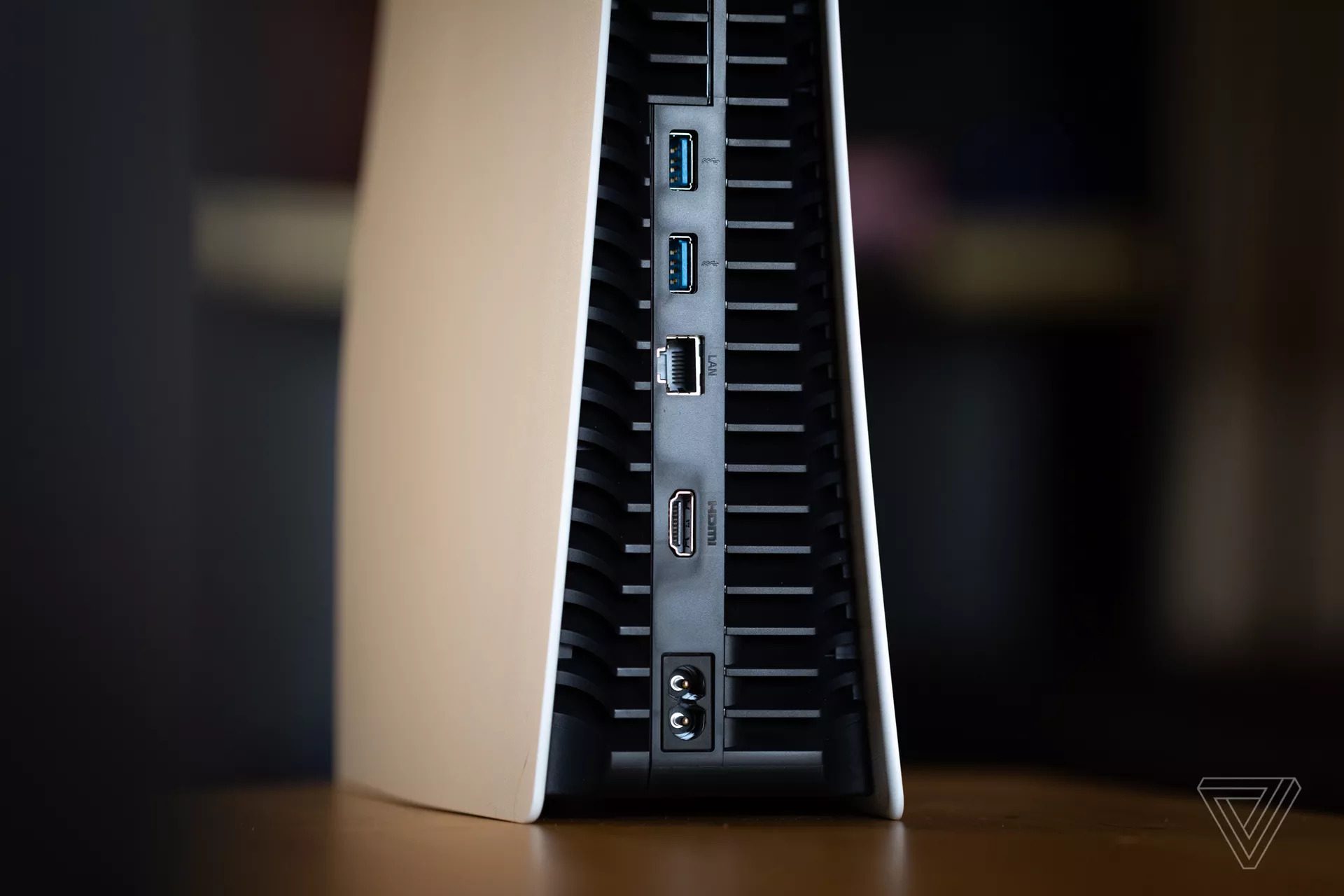 در قسمت جلوی کنسول، دو پورت USB-A و USB-C قرار گرفته و پایینتر دکمههای خروج دیسک و پاور به چشم میخورند. نوار پشت کنسول سایر پورتهای اصلی را به شکل عمودی در بر گرفته است. از پایین به بالا به ترتیب ورودی برق، پورت HDMI، پورت اترنت و دو پورت USB-A 3.0 قرار دارند. بالای این بخش خروجی هوا قرار گرفته و در بالاترین بخش پشت کنسول هم قفل مخصوص کنزینگتون جا خوش کرده است. موازی با این قسمت در کنار پوستهی سمت راست کنسول، تکهای با نقش لوگویهای مربع، دایره، مثلث و ضربدر دیده میشود که در واقع نشانهگر محل قرارگیری گیرهی استند است.