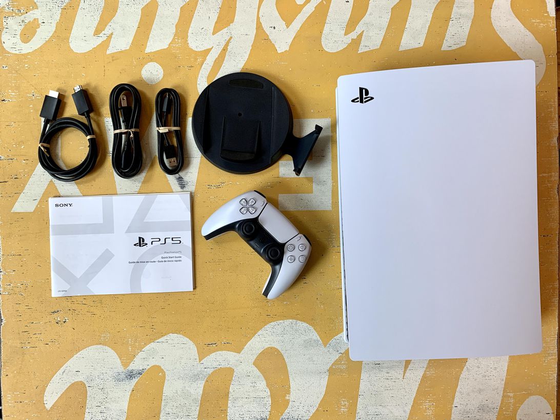 با باز کردن جعبهی داخلی PS5، اولین چیزی که به آن برمیخورید، اقلام همراه کنسول است. سونی همراه با کنسول خود یک کنترلر دوالسنس، کابل برق، کابل HDMI 2.1، کابل USB-C برای شارژ دسته، استند مخصوص و راهنمای راهاندازی عرضه میکند. برخلاف ایکسباکس، خبری از باتریهای قلمی نیست چرا که دوالسنس از باتری داخلی بهره میبرد که میتواند یکی از نقاط قوت آن نسبت به کنترلر سری ایکس باشد. با برداشتن این قسمت، سامورایی عظیم سونی خودنمایی میکند. PS5 واقعا بزرگ است و این نکتهای است که تمام رسانههای دریافتکنندهی کنسول به آن اشاره کردهاند. با آن که از مدتها پیش مشخص شده بود که پلیاستیشن ۵ کنسول بزرگی خواهد بود، اما آنباکسرها اذعان کردهاند که حتی با آگاهی قبلی از اندازهی آن، پس از دیدنش شوکه شدهاند! PS5 حدودا ۴۰ سانتیمتر ارتفاع، ۲۶ سانتیمتر طول و ۱۰ سانتیمتر عرض دارد. چنین ابعاد عظیمی گواه این است که احتمالا برای جا دادن این کنسول که بیشتر به آسمان خراشی فضایی شبیه است، در ستاپ اتاقتان چالش سختی خواهید داشت. پلیاستیشن همچنین با ۴.۵ کیلو وزن نسبتا سنگین هم هست، اما این وزن با وجود اندازهی غولآسای کنسول زیاد به چشم نمیآید.