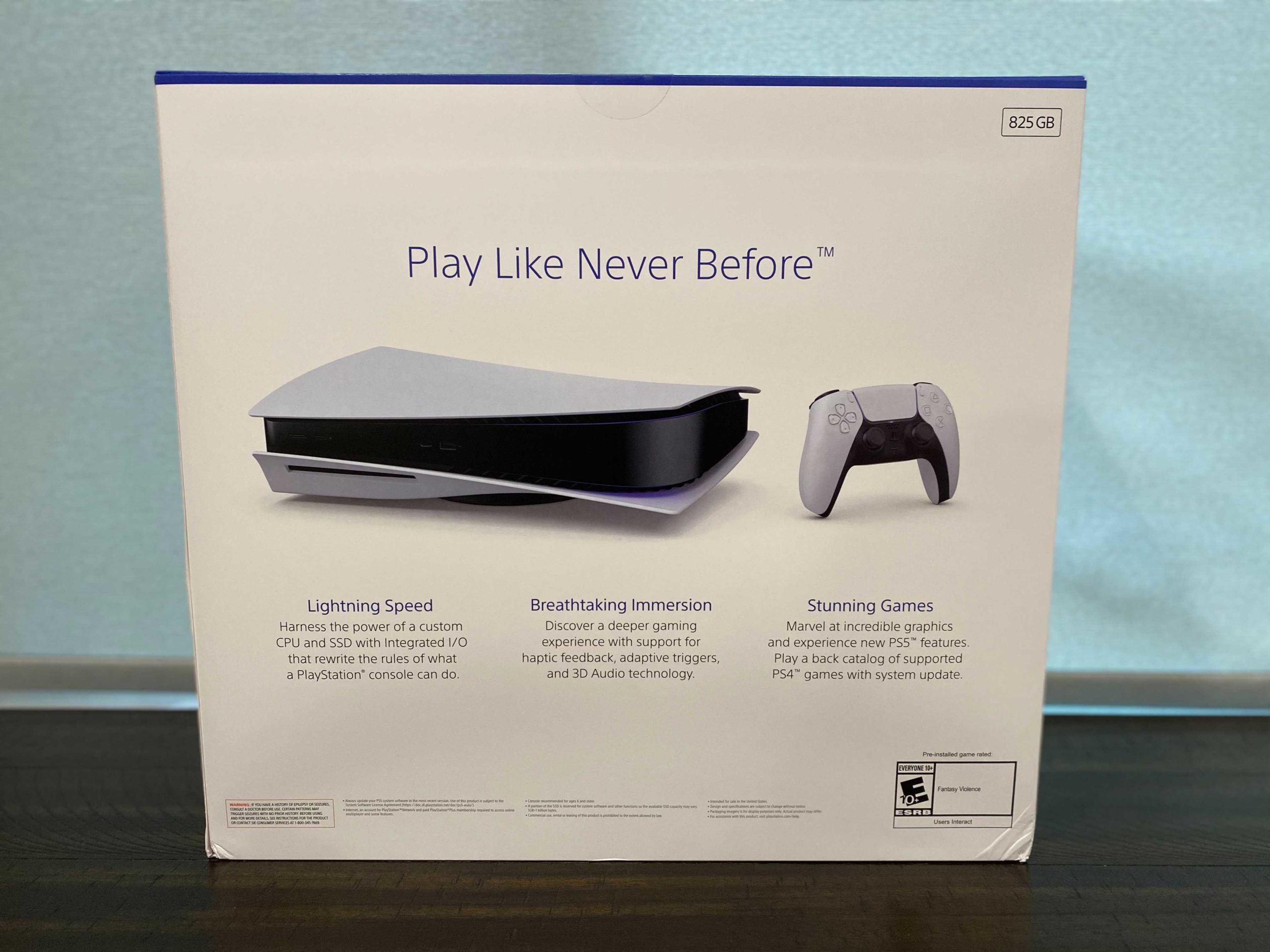 طرح روی جعبهی نسخهی عادی و دیجیتالی PS5 پیشتر مشخص شده بود. در حال حاضر نسخهی دیسکخور کنسول در اختیار رسانهها قرار داده شده و همانطور که از تصاویر برمیآید، با جعبهای بسیار ساده و بیآلایش طرف هستیم. بستهبندی PS5 دقیقا برخلاف رقیبش، ایکسباکس سری ایکس، هیچ زرق و برق خاص و چشمگیری ندارد و کنسول و اقلام همراه به سادهترین شکل ممکن در آن قرار داده شدهاند. در قسمت جلویی نمایی از کنسول و کنترلر دوالسنس نقش بسته و بالای آن هم عبارات 8K، 4K 120 و HDR به چشم میخورد. در پشت جعبه، توضیحات تبلیغاتی از قدرت کنسول و قابلیتهای آن نوشته شده و همچنین تصاویری از حالت افقی PS5 هم دیده میشود.