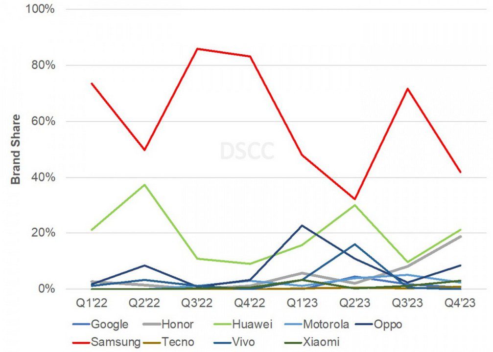 دلیل اصلی این اتفاق هم عرضهی کمتر از انتظار گوشی تاشو توسط سامسونگ و همچنین تأخیر در عرضهی گوشی جدید بوده است. انتظار میرود سهم سامسونگ از بازار گوشیهای تاشو در سه ماه چهارم به ۴۲٪ کاهش پیدا کند که در مقایسه با ۸۶٪ در سال گذشته افت قابل توجهی محسوب میشود.