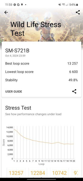 گلکسی S24 FE به طور کلی از پایداری پردازشی 52٪ و پایداری گرافیکی 49.8٪ بهره میبرد. این بدین معناست که عملکرد پردازشی و گرافیکی در طول زمان به شدت نوسان میکند و بعد از 10 دقیقه اول استفاده، عملکرد آن بهطرز قابل توجهی کاهش مییابد.