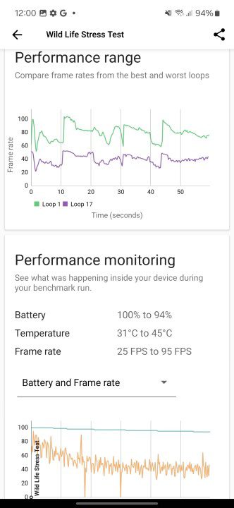 در طول 20 دقیقه بار سنگین، شارژ دستگاه از 100 به 94 درصد کاهش مییابد و دما بین 31 تا 45 درجه سانتیگراد متغیر است. این افزایش دما، نشاندهندهی فشار زیاد به سختافزار است. همچنین فریمریت در این مدت از 25 تا 95 متغیر است که نشاندهندهی نوسان شدید در عملکرد بازی است.