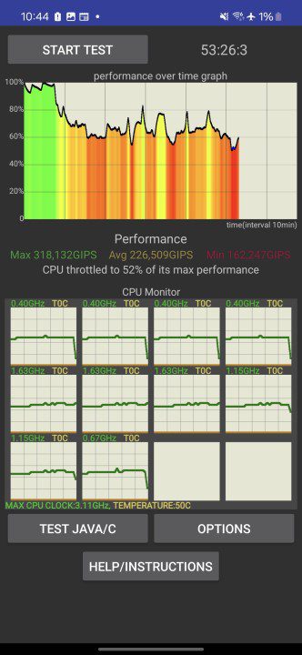 گلکسی S24 FE در طول تستهای استرس طولانیمدت داغ نه ولی گرم میشود. به طور کلی، این گوشی عملکردی در سطح پرچمدار دارد و به راحتی از پس بازیها و کارهای سنگین برمیآید.