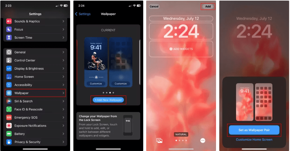 آموزش بعدی شاید کمی کنایهآمیز باشد اما به هر حال دارندگان آیفون هم شانس این را دارند که با تصاویر زمینه گلکسی S24، طعم استفاده از این گوشیها را بچشند. کافی است وارد تنظیمات رفته و روی Wallpaper کلیک کنید. سپس گزینهی Add New Wallpaper کلیک کرده و بعد از انتخاب تصویر زمینه مورد نظر، روی گزینهی Add و در نهایت Set as Wallpaper Pair کلیک کنید.