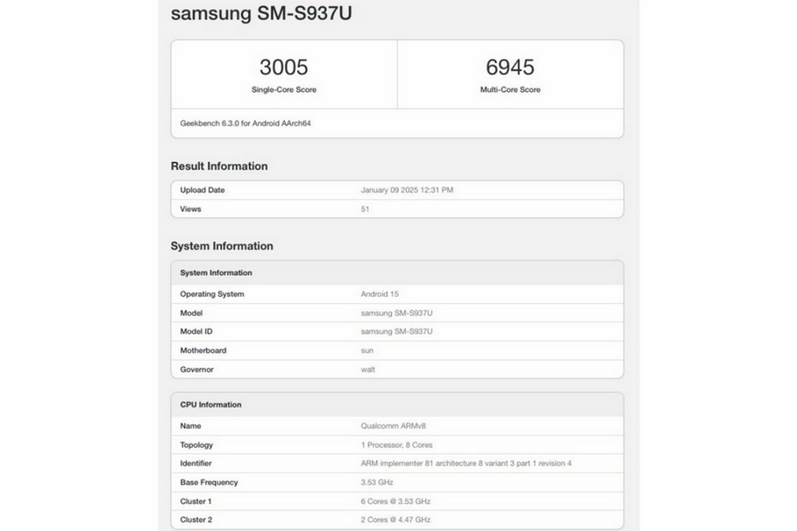 مدل SM-S937U گلکسی S25 Slim در بنچمارکهای تکهستهای و چندهستهای به ترتیب امتیازهای 3005 و 6945 را ثبت کرده که با نتایج ثبتشده برای پردازنده اسنپدراگون 8 نسل 3 شباهت دارد. این موضوع باعث سردرگم شدن کاربران شده چرا که اسنپدراگون 8 الیت باید امتیازی نزدیک به 10 هزار را در بخش چند هستهای کسب کند. اما این امتیازات در واقع مربوط به اسنپدراگون 8 نسل 3 هستند.
