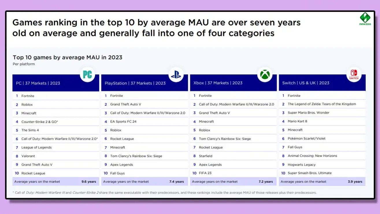 وبسایت Newzoo به تازگی گزارشی در خصوص عادتها و علایق بازیکنها در حوزههای مختلف گیمینگ نظیر زمان تجربه بازیها منتشر کرده که بر اساس آن، حدود ۶۰ درصد از زمانهای صرف شده مختص بازیهایی است که ۶ سال یا بیشتر از عرضه آن گذشته و عموما نیز بازیهای سرویس محور هستند.
