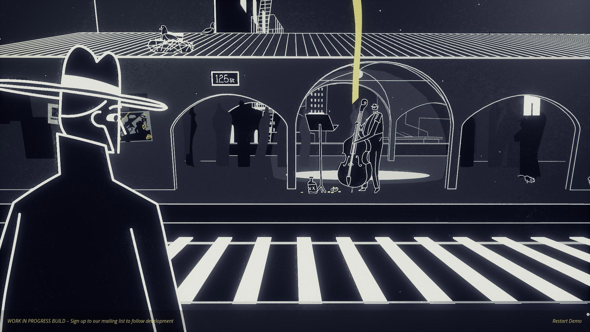 بازی از لحاظ بصری وفادار به نوآر کلاسیک است. تنها رنگهایی که میبینیم سیاه و سفید هستند. تیپ شخصیتها هم مشابه تیپهای دههی ۴۰ و ۵۰ میلادی آمریکاست؛ کلاه شاپو، بارانی بلند، کت و شلوار سیاه با خطهای سفید. گرافیک بازی در عین سادگی جزئیات، پیچیده است و هر صحنه، چند لایهی مختلف دارد که ترکیبی از مدلهای دوبعدی و سهبعدی هستند. معمولا عادت داریم از این دست عناوین مستقل با موتور گرافیکی Unity ساخته شود، اما استودیوی Feral Cat Den سازندهی بازی از انجین Unreal 4 استفاده کردهاند که نتیجهاش بسیار جذاب از آب درآمده است. این استایل بصری در بازی با موسیقی جز همراه میشود تا سهگانهی هویت بازی کامل شود. به نظر میرسد که جز در Genesis Noir همانقدر اهمیت دارد که در بازی Ape Out تبدیل به یکی از مشخصهها شده بود؛ پس تنها یک موسیقی ساده نیست، بلکه با گیمپلی و روایت در هم تنیده شده است. در دمو میبینیم که شخصیت اصلی، خود یک ساکسوفون به همراه دارد و در ادامه با یک نوازندهی کنترباس همراه میشود و این دو نفر در کنار همدیگر، یک سکانس موزیکال جالب به ارمغان میآورند. جذابترین بخش دمو برای من، همینجا بود که این دو مینواختند و من میتوانستم یا سریع سکانس رو جلو ببرم و دمو را تمام کنم، یا با آنها همراه شوم و چند دقیقهای، خود را در جادوی جز غرق کنم.
