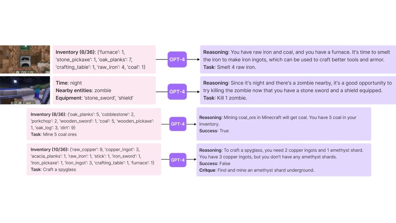 تصور کنید خورشید در بازی غروب کرده و اسکلتها از لانه خود بیرون میآیند. حال بازیکن (یا در مورد خاص ما هوش مصنوعی) با خود میگوید: یک بازیکن خوب در این لحظه چکار میکند؟ سیستم GPT-4 در پاسخ به این پرسش اساسی گفته که اگر به دنبال گشت و گذار بدون مشکل در جهان هستید، باید به ساخت ابزار و یک شمشیر پرداخته و از آنها برای شکست دادن اسکلتها استفاه کنید. این پاسخ برای بازیکن به جملات «سنگ و چوب جمع آوری کن و با آنها شمشیر و میز ساخته، آنها را در دست بگیر و به مبارزه در برابر اسکلتها بپرداز.» تبدیل میشود.