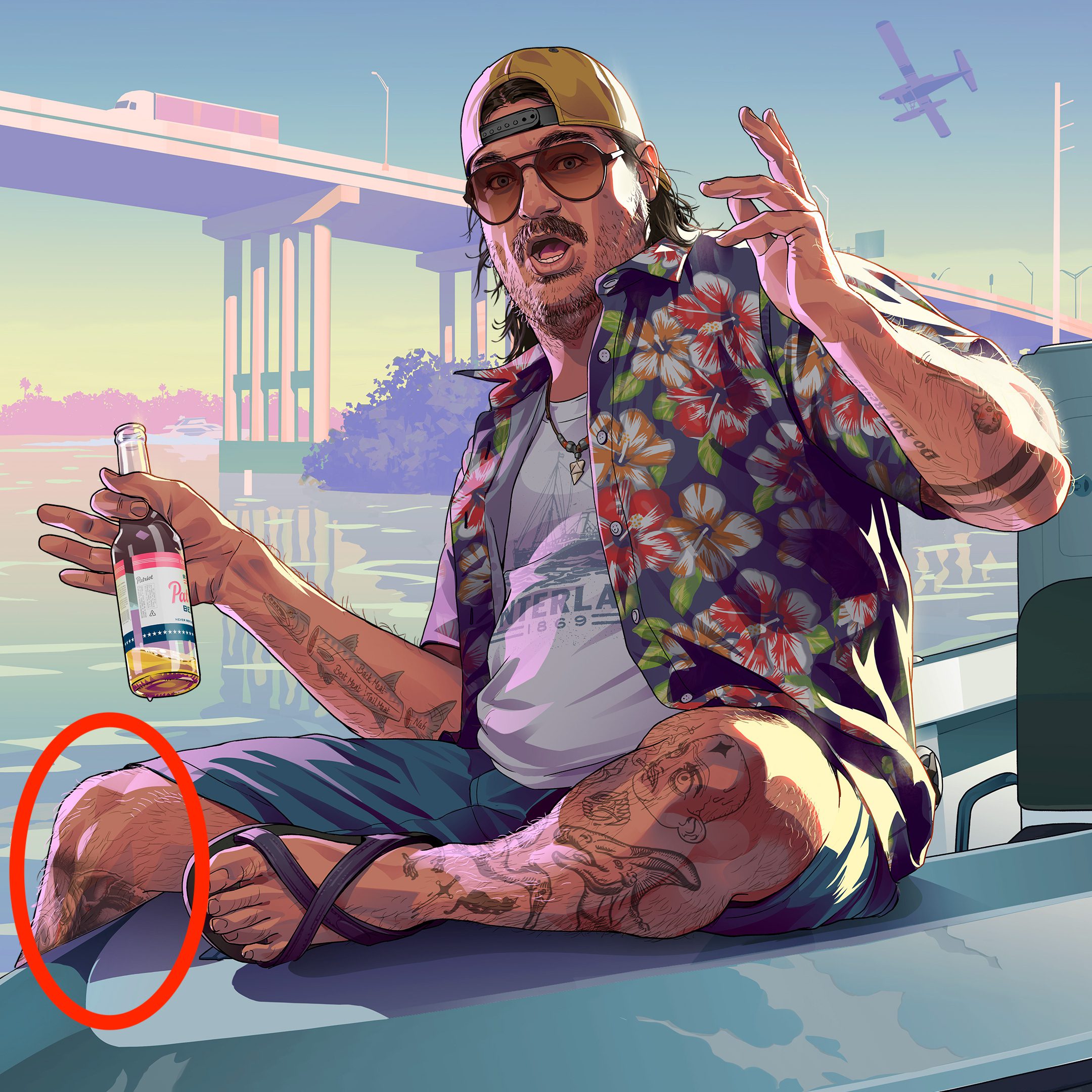 به نظر میرسد این تتو بخش زیادی از ساق پای او را پوشانده و تا زانو امتداد یافته اما به طور عمده توسط بدنه قایق پنهان شده است و همین موضوع سبب شده که نتوان با اطمینان اظهار داشت این شخصیت بازی GTA 6 واقعا کاراکتر بدنام بازی Manhunt را به نمایش میگذارد.