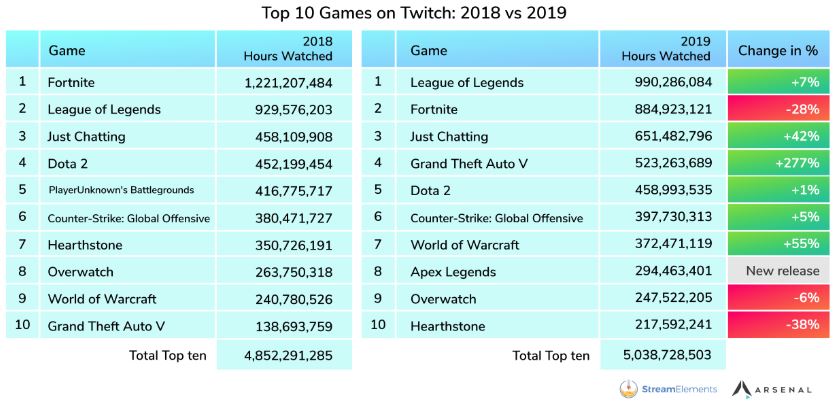 بیشترین رشد را GTA V داشته است. میزان بازدید استریمهای این بازی در سال ۲۰۱۸ رقم ۱۳۸ میلیون ساعت بود اما بهواسطهی رشد ۲۷۷ درصدی در سال جاری میلادی، به رقم ۵۲۳ میلیون ساعت رسیده است. چنین رشدی را بدون شک باید به پای سرورهای Roleplaying نوشت. این سرورها که برای نخستین بار در سال ۲۰۱۷ در دسترس قرار گرفتند، به کاربران خود اجازه میدهند تا به جای اینکه کنترل شخصیتهای خلافکار را بر عهده بگیرند، در نقش افراد معمولی ظاهر شوند. معرفی این سرورها باعث شد تا طی دو سال اخیر بسیاری از استریمرهای شناخته شده جذب نسخهی پنجم سری GTA شوند.
