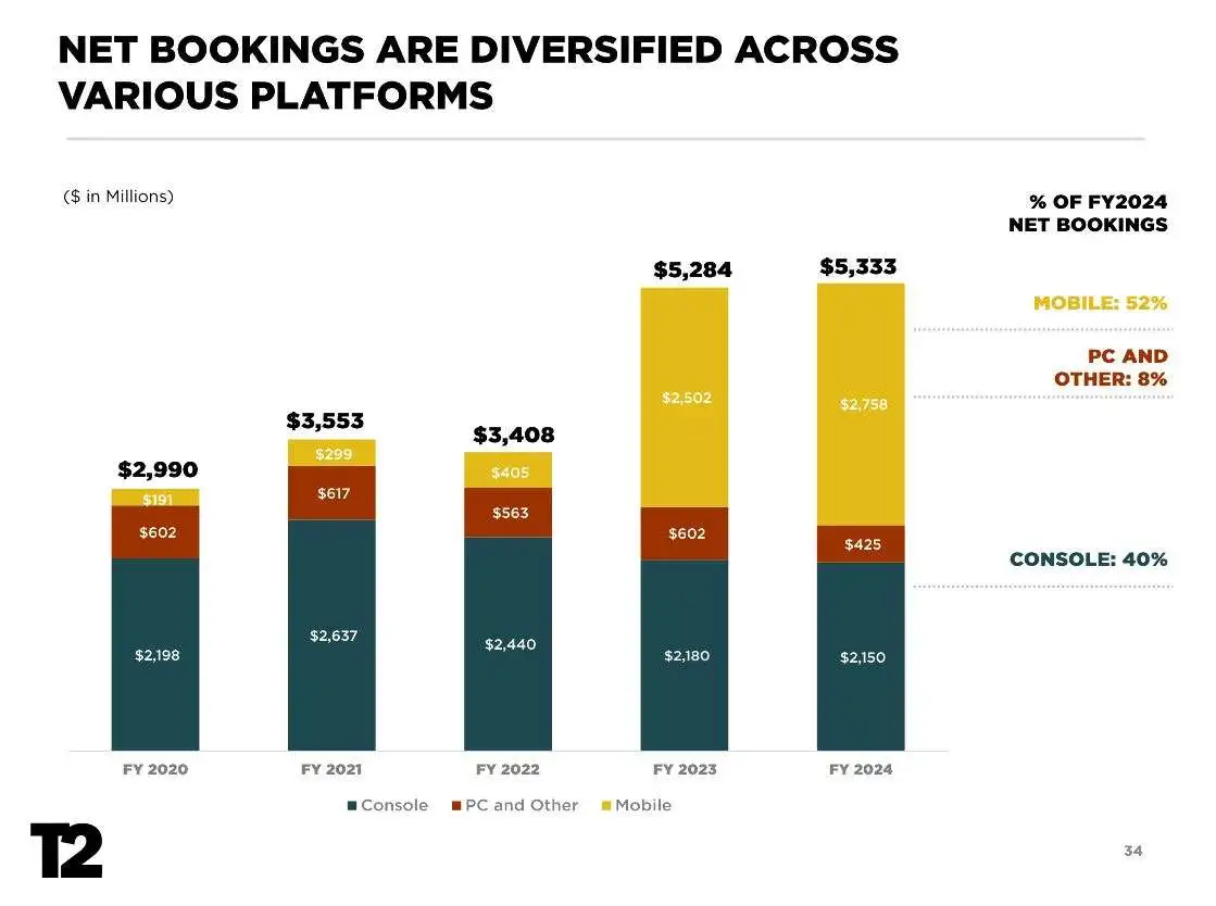 بر اساس تازهترین گزارش مالی شرکت تیک تو اینتراکتیو، بیش از ۵۲ درصد درآمد این کمپانی در سال مالی ۲۰۲۴ میلادی به بازیهای موبایل آن اختصاص دارد. سهم کنسولها از این درآمدها برابر با ۴۰ درصد بوده و این در حالی است که پلتفرم کامپیوتر تنها ۸ درصد از درآمد کل سالانه شرکت تیک تو را تشکیل میدهد. نکته قابل توجه این است که درآمد حاصل از بازی GTA Online، پردرآمدترین محصول تیک تو، در این آمار لحاظ شده است.