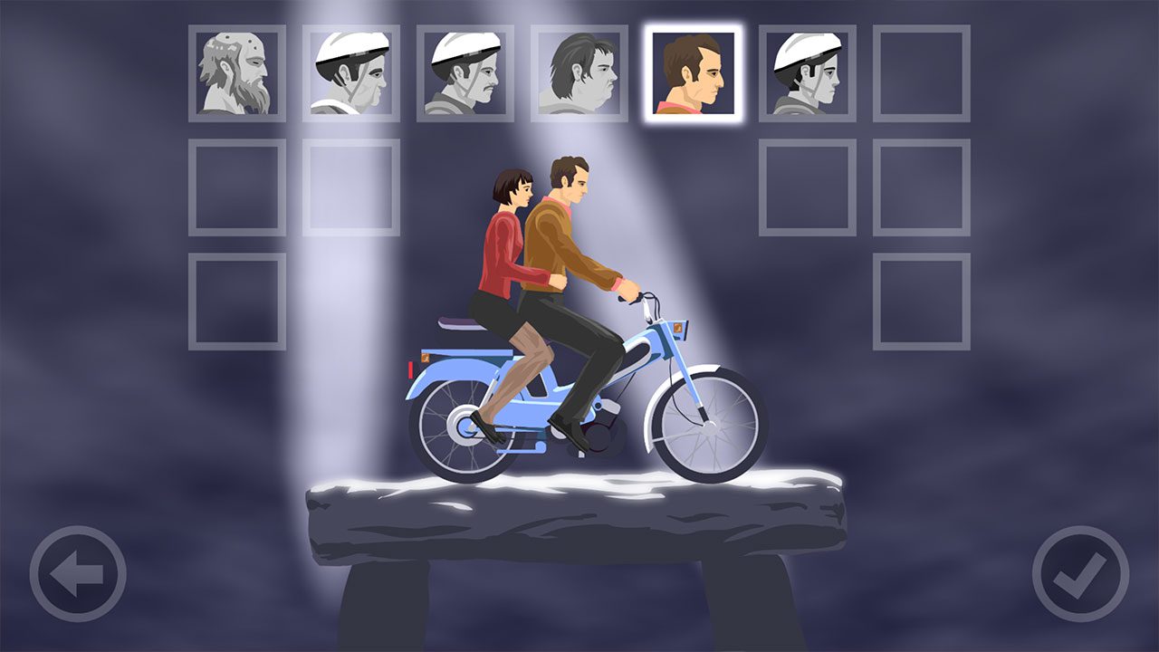 قبل از شروع بازی باید یک کاراکتر انتخاب کنید؛ کاراکترها ویژگی، اهداف و وسیلهی نقلیه متفاوتی نسبت به یکدیگر دارند. یکی باید به محل کارش برسد و دیگری فرزندش را نجات دهد، یکی هم احتیاج دارد تا ثابت کند با اینکه چاق است و از اجتماع طردش میکنند، مهارتهایی هم دارد! کنترل وسایل نقلیه در Happy Wheels، شبیه به دیگر بازیها در همین سبک است؛ اهرمهای مخصوص جلو و عقب، پرش، ترمز و… برای هر وسیله تفاوت اندکی دارد اما از یک قانون کلی و ساده پیروی میکند. مثل دیگر بازیها، نمیتوانید وسایل نقلیهی خود را ارتقا دهید و باید با همان چیزی که دارید، سر کنید. نسخهی کامل Happy Wheels با پرداخت درونبرنامهای قابل خرید است.