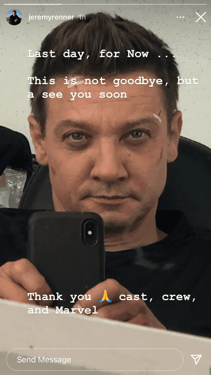 جرمی رنر چندی پیش تصویری را در بخش استوری اینستاگرام خود قرار داد که اطلاعات تازهای را از روند ساخت Hawkeye در اختیار علاقهمندان قرار میدهد. او ضمن تشکر از دستاندرکارن پروژه، دیگر بازیگران و مدیران مارول تایید کرد فیلمبرداری سریال به پایان رسیده است. تصویری که رنر برای استوری انتخاب کرده، صورت گریم شدهاش را نشان میدهد؛ گریمی که قطعا به یک صحنه اکشن تعلق دارد. در ادامه میتوانید تصویر را مشاهده کنید: