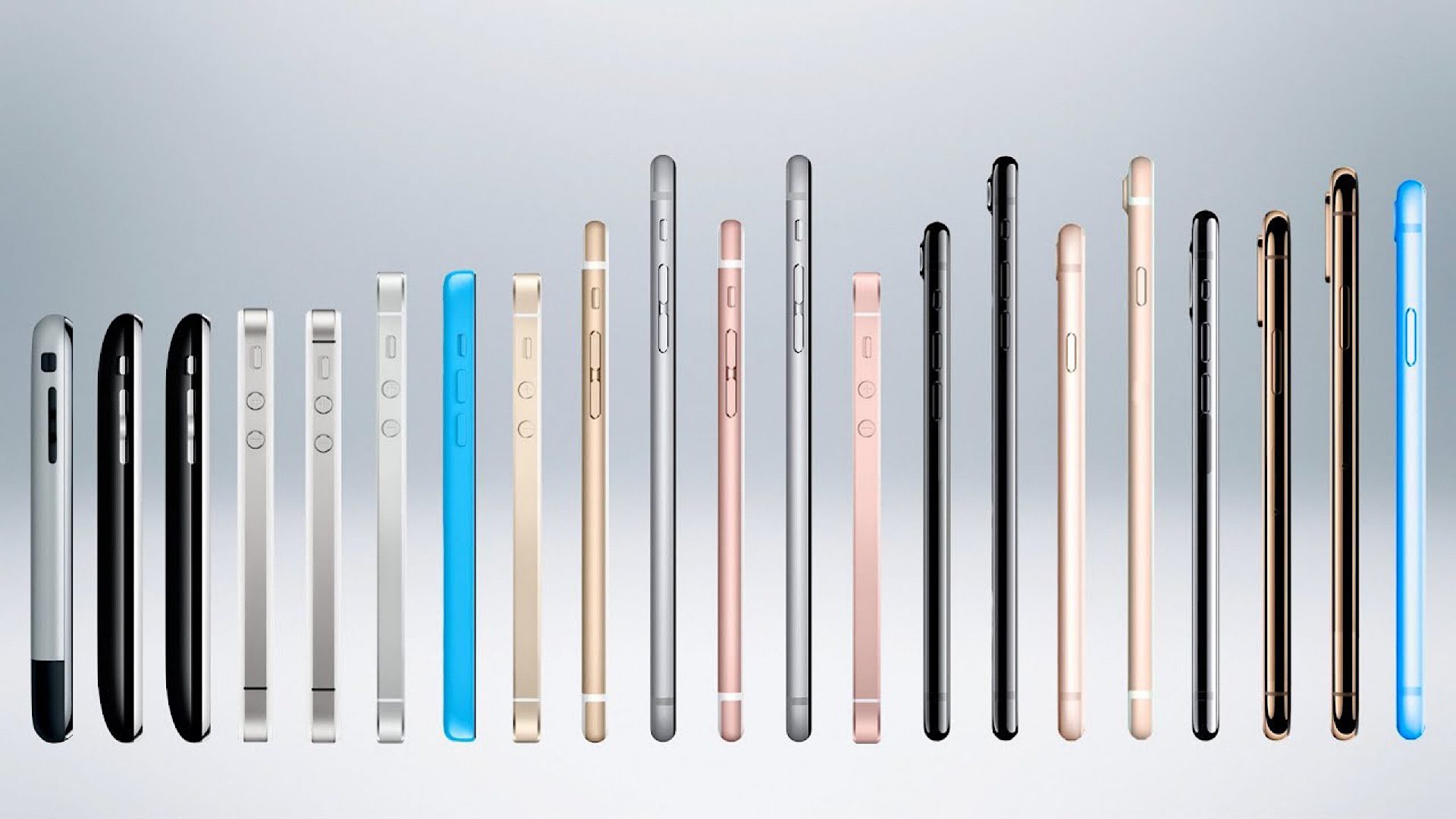 همانطور که در بالا اشاره کردیم، محبوبترین گجت شرکت اپل، iPhone است. در ۹ ژانویه سال ۲۰۰۷ اولین گوشی هوشمند شرکت اپل توسط استیو جابز معرفی شد. شرکت اپل این دستگاه را با یک نمایشگر 3.5 اینچی با رزولوشن 320 در 480 پیکسل و تراکم پیکسلی 163 پیکسل در هر اینچ مجهز کرد. این دستگاه دارای یک دوربین 2 مگاپیکسلی بود و همچنین در آن زمان جزو اولین گوشیهای هوشمند لمسی محسوب میشد. این گجت دارای یک نسخه 4 گیگابایتی و یک نسخه ۸ گیگابایتی بود که برای خرید این دو نسخه به ترتیب کاربران باید ۴۹۹ و ۵۹۹ دلار هزینه میکردند.