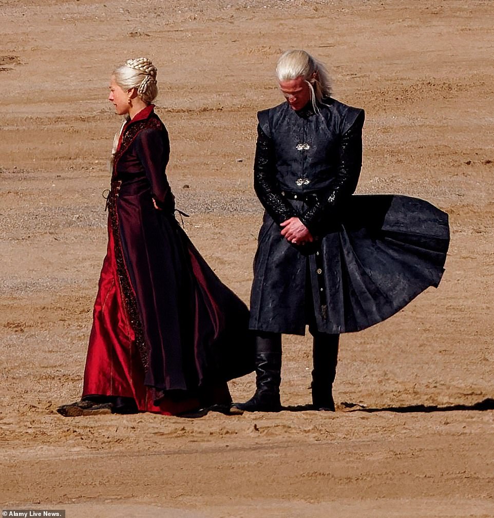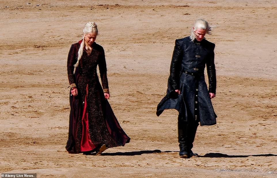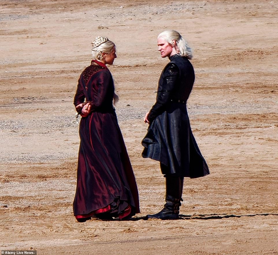 تصاویر مذکور که توسط Daily Mail منتشر شده است، ستارگان سریال مت اسمیت در نقش شاهزاده دیمون تارگرین و اما دارسی در نقش برادرزاده و همسر آیندهی او در لباسهای مخصوص خاندان تارگرین را نشان میدهد. در این تصاویر، این دو در حالی مشاهده میشوند که مشغول به مکالمه و قدم زدن در ساحلی در کورنوال (شهرستانی واقع در جنوب غربی انگلستان) هستند. در ادامهی صحنه دارسی از اسمیت فاصله میگیرد و به سمت آب قدم برمیدارد. نکتهی قابل توجه در این تصاویر، رنگ پلاتینیوم موهای این بازیگران است که در واقع نماد خاندان تارگرین محسوب میشود.