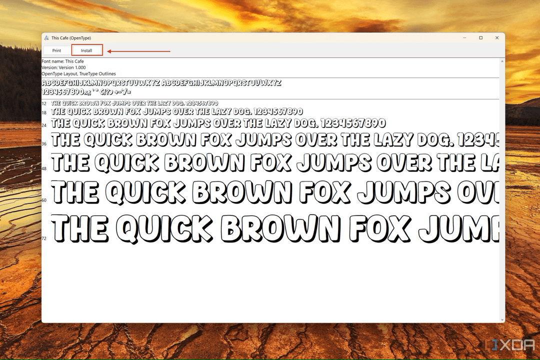 پس از استخراج فایل ZIP، روی فایل فونت دوبار کلیک کنید تا پیشنمایش آن نمایش داده شود. اگر از ظاهر فونت راضی هستید، روی دکمه «Install» کلیک کنید تا فونت روی ویندوز 11 شما نصب شود. پیشنمایش برای زمانی مناسب است که شما ندانید فونت مورد نظر دقیقا چه شکل ظاهری دارد.