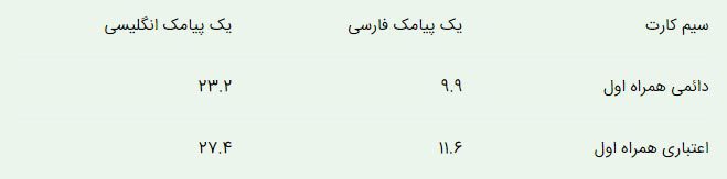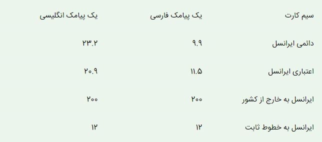 به این ترتیب مشاهده میکنیم که هزینهی ارسال پیامک از طریق سیمکارتهای دائمی همراه اول و ایرانسل تفاوتی با یکدیگر ندارند اما برای سیمکارتهای اعتباری، هزینهی سیمکارتهای همراه اول برای ارسال پیامهای لاتین تقریبا ۷۰ ریال گرانتر است.